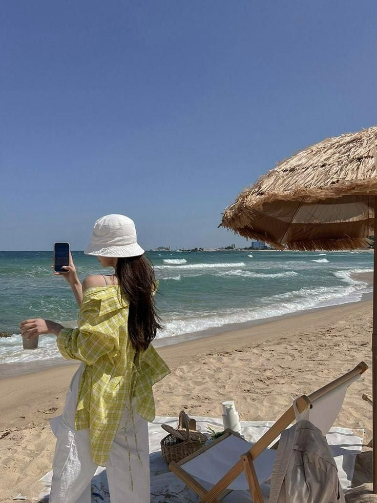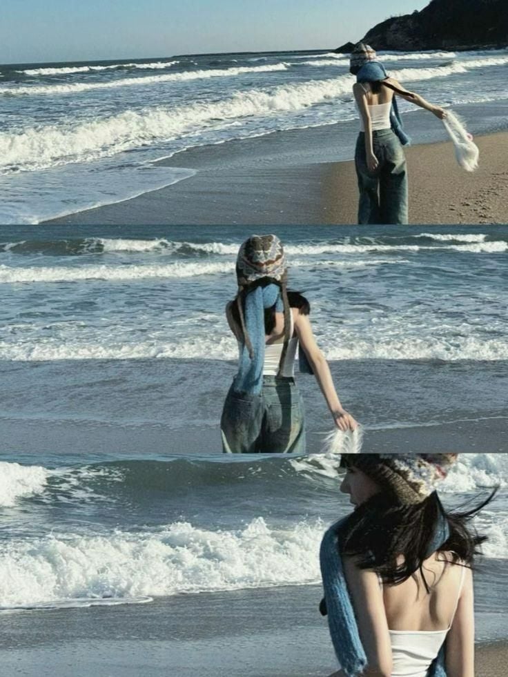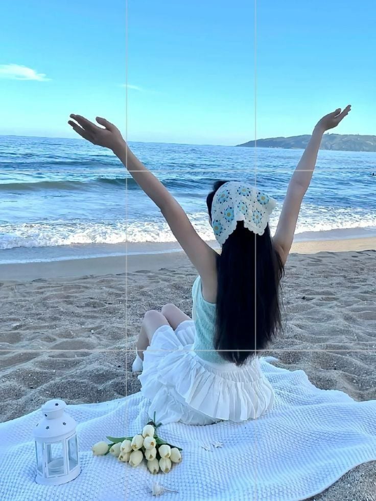 Hãy thử cúi người hoặc ngồi xổm, vươn tay chạm nhẹ vào lớp bọt biển trắng xóa, những hạt cát mịn hay vờ nhặt vỏ sò trên bờ cát. Những cử chỉ tương tác nhẹ nhàng này giúp xua tan sự gượng gạo, làm cho bức hình thêm phần sinh động, trong trẻo và ngập tràn hơi thở tự do.