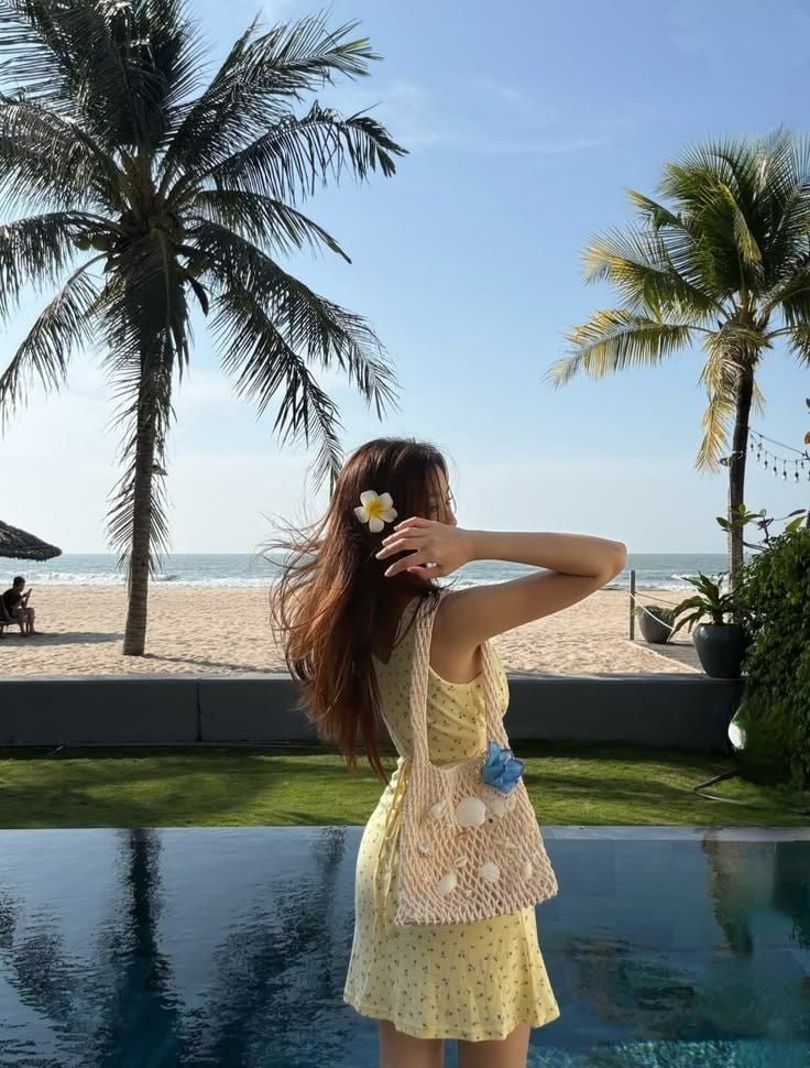 Góc chụp từ sau lưng, một tay níu nhẹ tay người chụp, một tay buông lơi đón gió biển, mang đến một 'vibe' nàng thơ cực kỳ trong trẻo và cuốn hút. Tà váy baby doll bồng bềnh lả lướt trên nền biển xanh không chỉ tôn lên nét nữ tính, thanh lịch mà còn hô biến khoảnh khắc du lịch đời thường thành một trang lookbook đầy chất thơ.