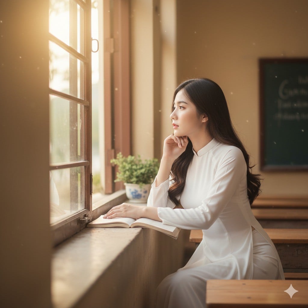 Khung cửa sổ lớp học là nơi chứng kiến biết bao cảm xúc của tuổi học trò. Để có một bức ảnh "so deep", hãy ngồi hoặc đứng nghiêng người bên cửa sổ, để ánh sáng tự nhiên chiếu vào một bên khuôn mặt, tạo hiệu ứng khối rõ nét. Bạn có thể chống cằm, nhìn ra xa xăm như đang suy tư về điều gì đó, hoặc cầm một cuốn sách giả vờ đọc.