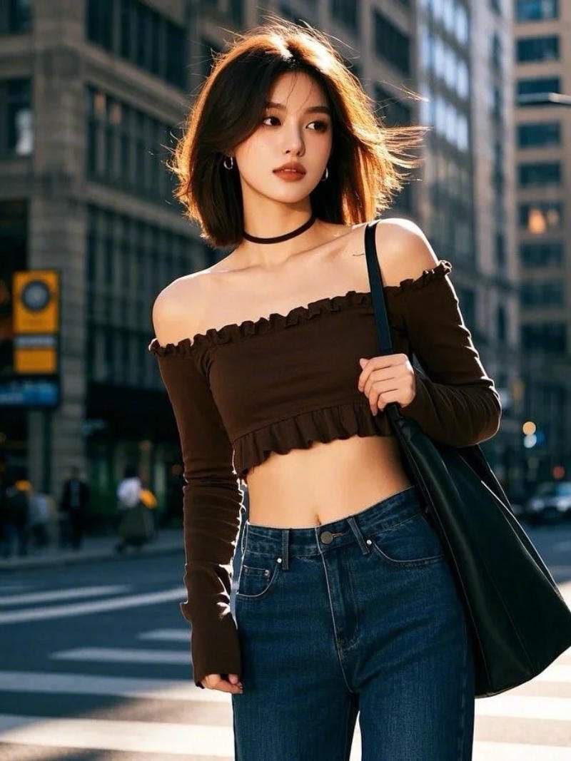 Đứng giữa phố với bộ trang phục cá tính gồm áo croptop lệch vai màu đen và quần jean ống rộng thùng thình (baggy jeans). Một tay bạn cầm túi xách dây xích buông lơi, tay kia đưa lên nắm nhẹ lọn tóc đang bay trong gió. Đầu hơi nghiêng, mắt nhìn xuống hoặc nhìn xa xăm tạo vẻ lơ đễnh nhưng cuốn hút.