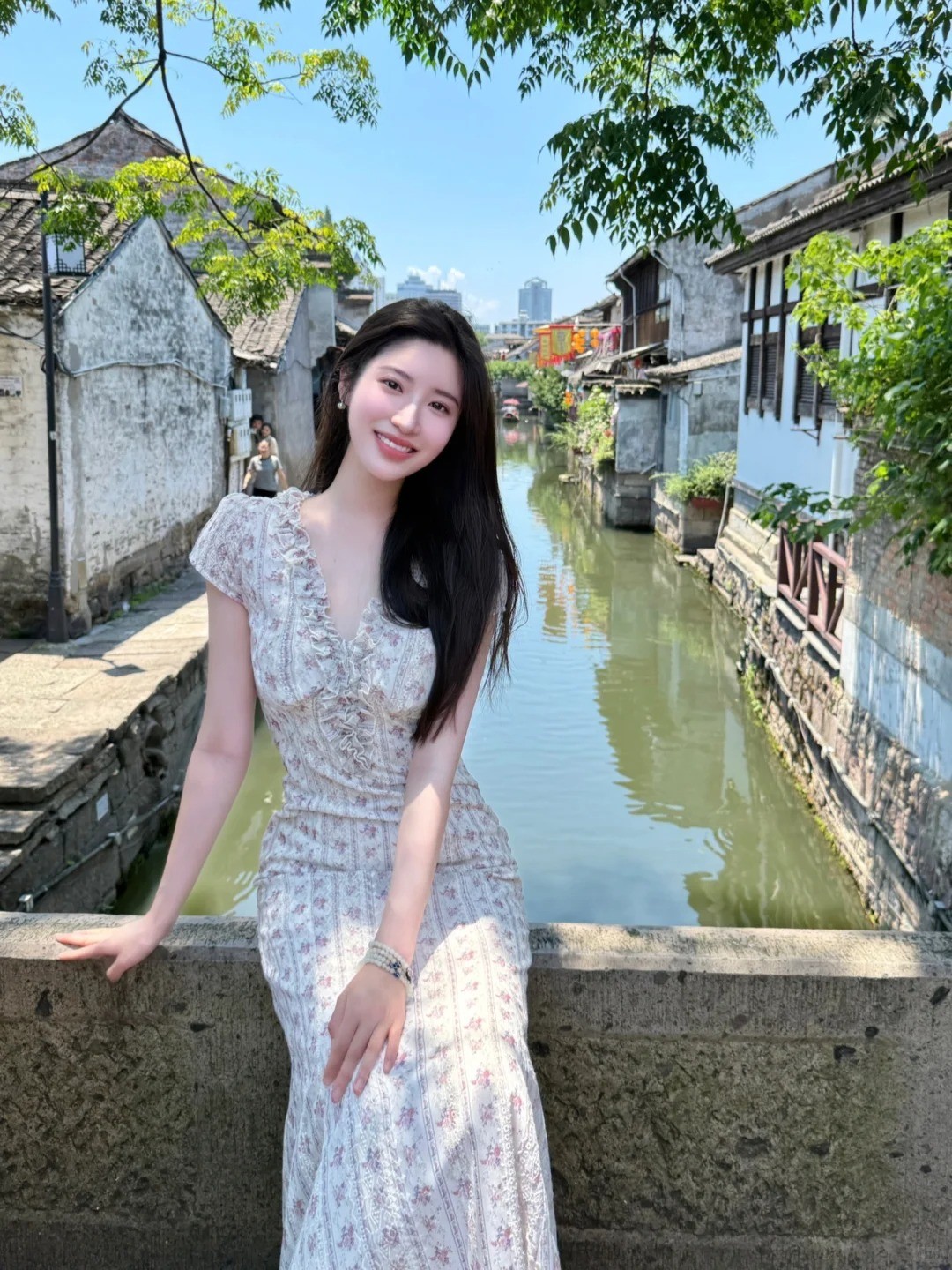 Kiểu ngồi trên thành cầu mang đến một vẻ đẹp cổ điển và thơ mộng, đặc biệt hợp với những cây cầu đá mang dấu ấn thời gian. Bạn hãy ngồi ngay ngắn, hai tay đặt nhẹ bên cạnh để giữ thăng bằng, lưng thẳng và mắt nhìn xuống dòng nước hoặc con đường bên dưới. Biểu cảm trầm tư, thanh lịch sẽ tạo nên một bức ảnh đậm chất nghệ thuật, như một nàng thơ lạc giữa không gian cổ kính.