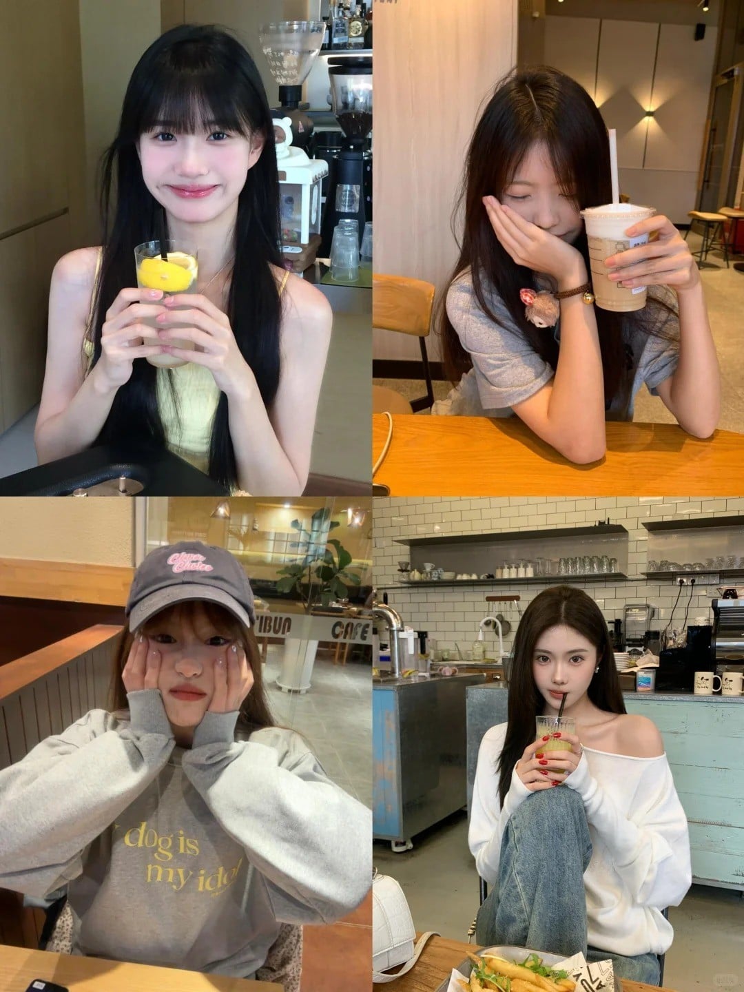 Không cần quá cầu kỳ, chỉ cần ngồi ngay ngắn tại bàn, hai tay đan vào nhau đặt dưới cằm và ánh mắt nhìn thẳng vào ống kính. Ly trà sữa được đặt ngay ngắn trên bàn, trở thành một phần của khung cảnh yên bình. Kiểu chụp này toát lên vẻ dịu dàng, nữ tính và có chút trầm tư, rất phù hợp với không gian quán cà phê thanh lịch.