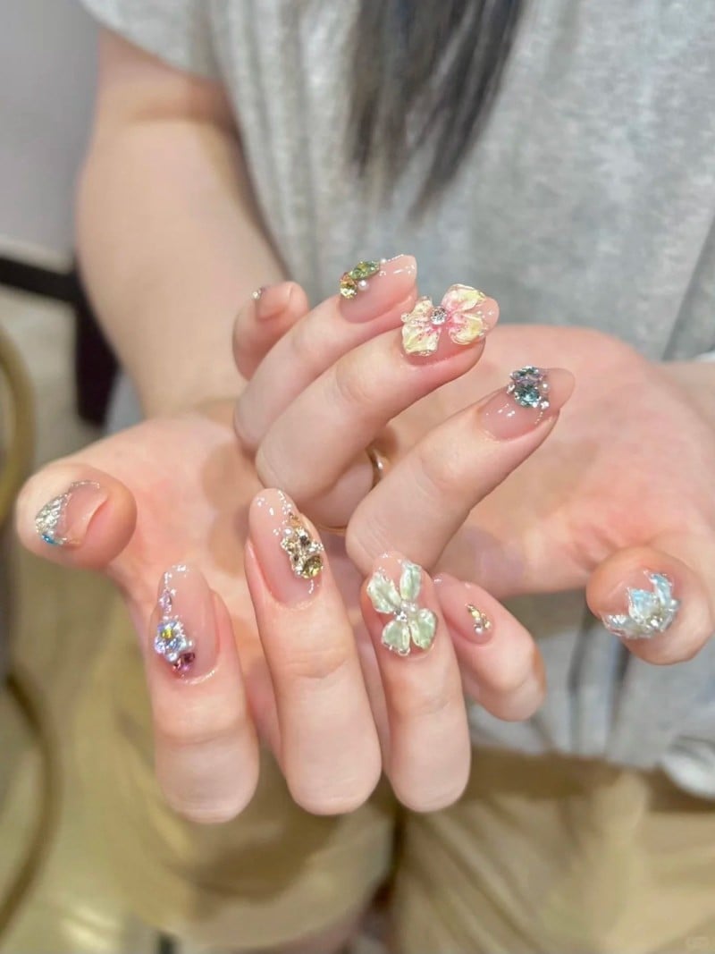 Mẫu nail đính đá sang chảnh ưa chuộng những màu sắc nhẹ nhàng, có sự kết hợp giữa nhiều chi tiết, có điểm nhấn nhá để tạo được một vẻ ngoài quyến rũ và đặc biệt.