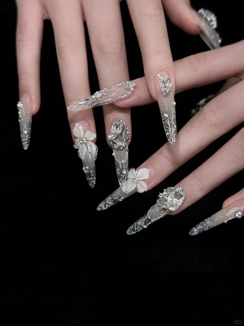 Kiểu nail dài cho nàng chẳng ngại vướng víu, điểm xuyết thêm những chiếc đá xinh xắn và lấp lánh cực "keo lỳ".