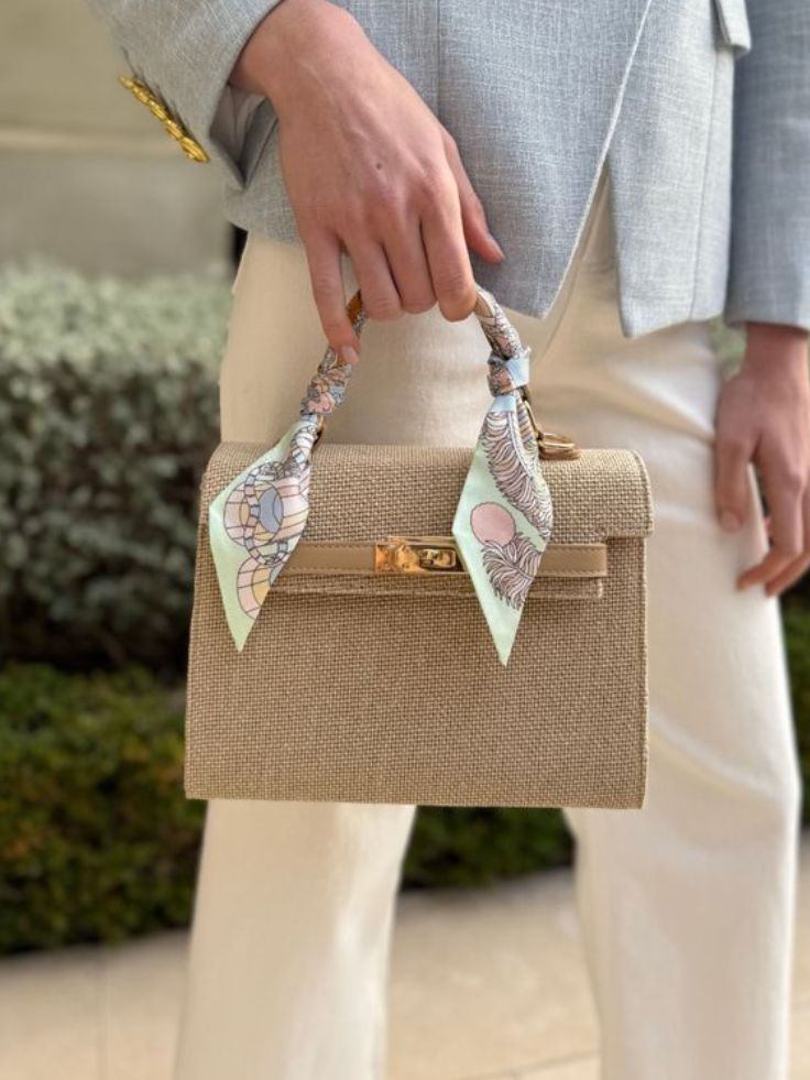 Cuối cùng, không thể bỏ qua công năng nguyên bản của Twilly: trang trí túi xách. Việc quấn khăn quanh quai túi (handle wrap) không chỉ giúp bảo vệ phần da túi khỏi mồ hôi tay và bụi bẩn mà còn "thay áo mới" cho chiếc túi cũ.