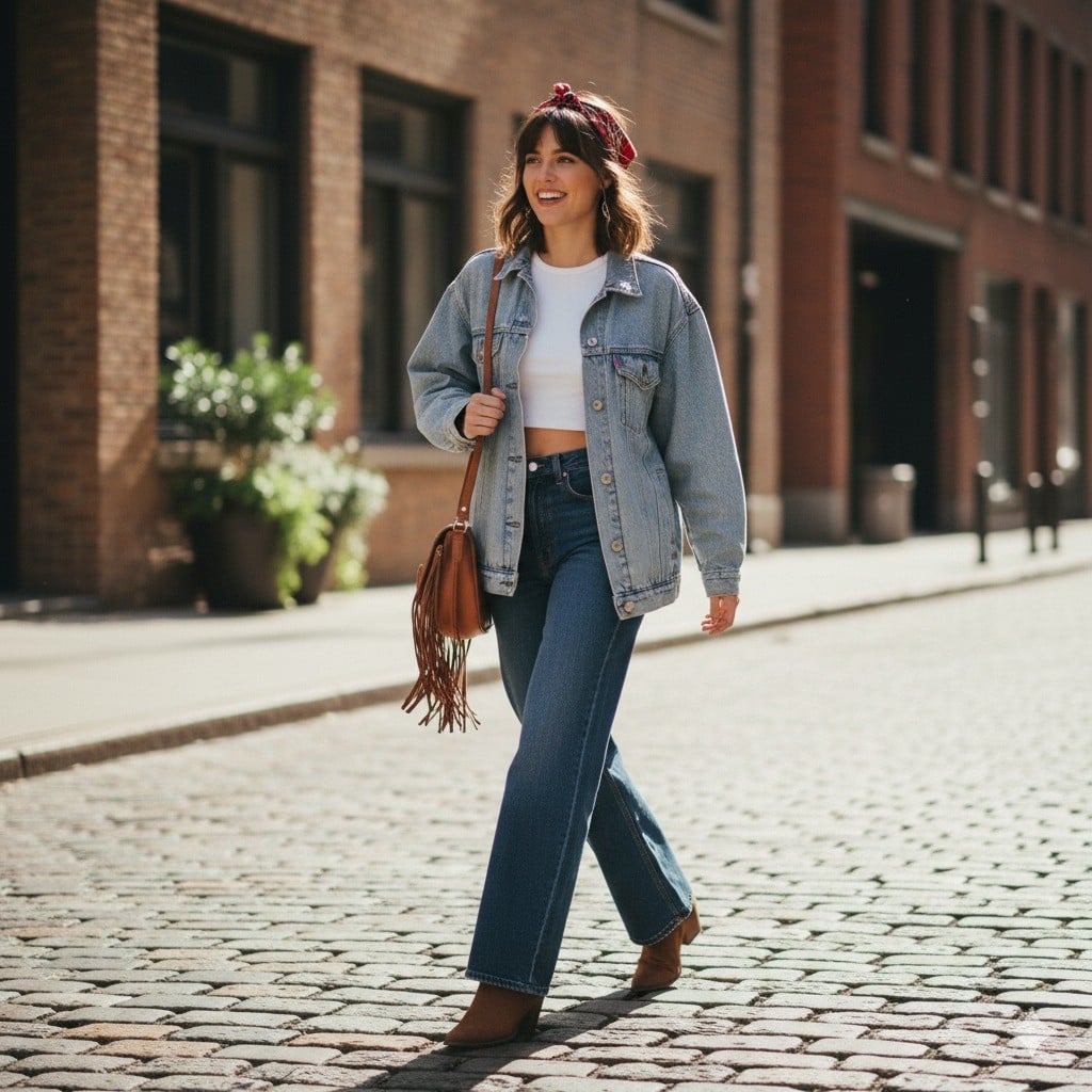 Đây là cách phối đồ kinh điển nhưng không bao giờ lỗi mốt. Để tạo cá tính, hãy chọn các item có phom dáng độc đáo: một chiếc áo khoác denim oversized mặc cùng quần jeans ống đứng (straight-fit) hoặc ống loe (flare). Hoàn thiện set đồ với một đôi bốt da cá tính, kính râm và thắt lưng bản to để tạo điểm nhấn.