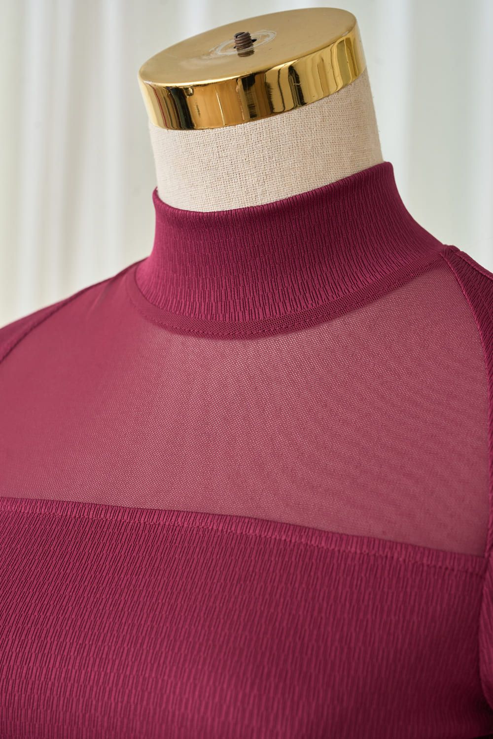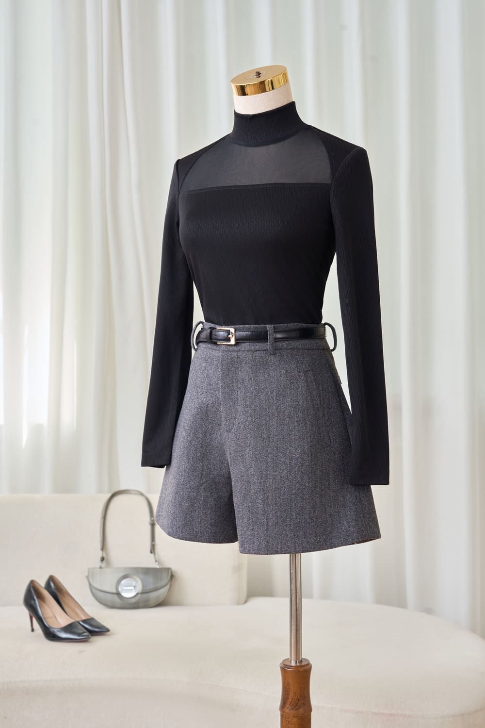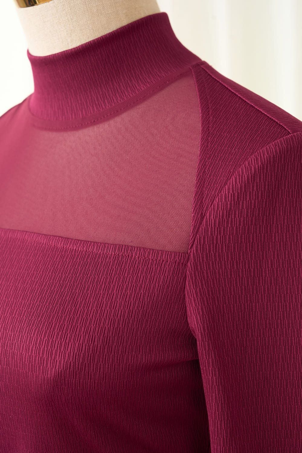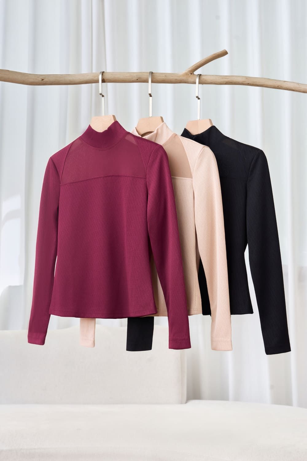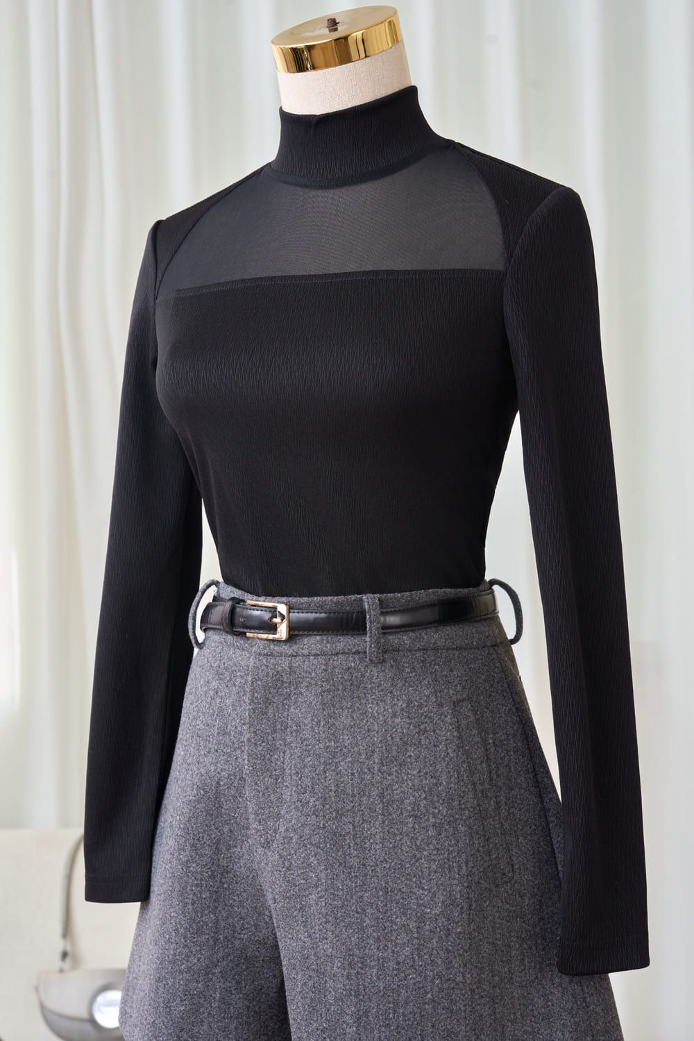 Áo len nữ vải len gân dài tay cao cổ phối lưới ngực