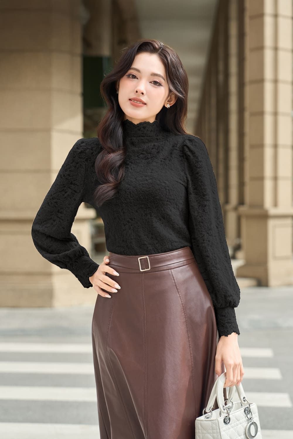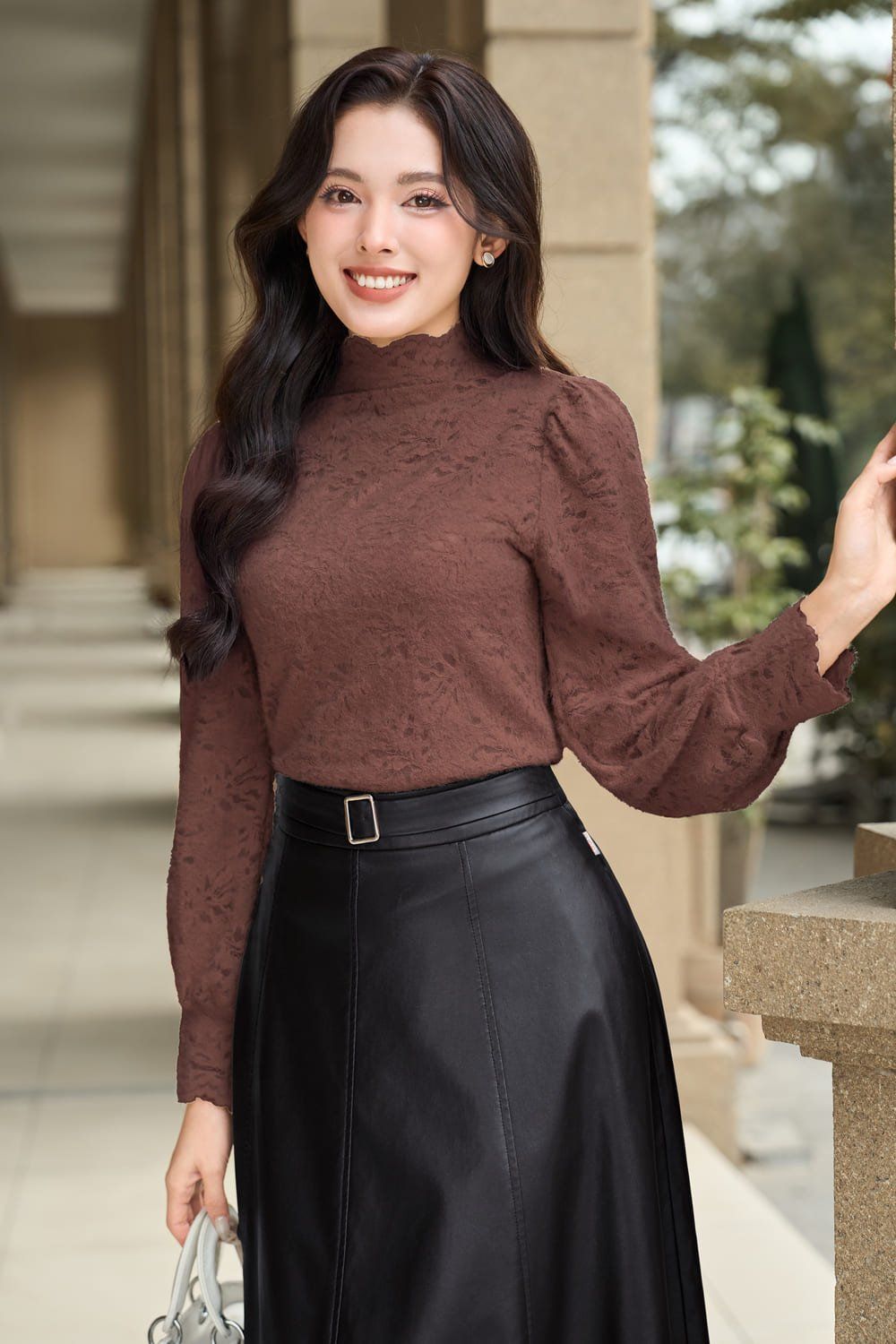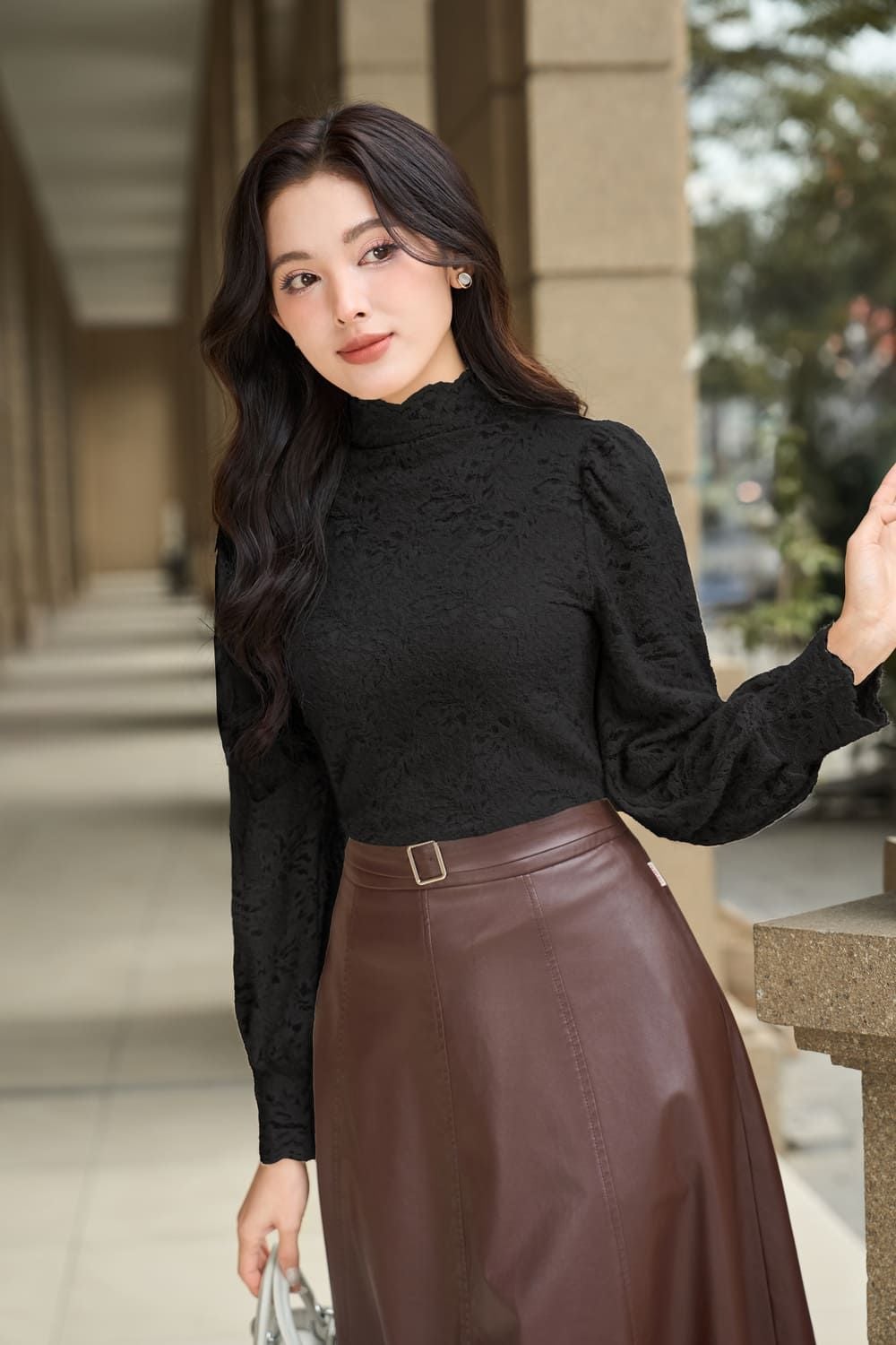 Áo kiểu nữ chất ren nhung cổ cao dáng vai bồng