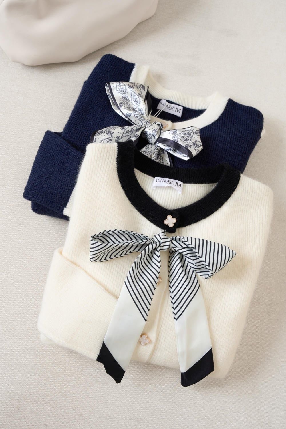 Áo len nữ lông thỏ dài tay cổ nơ lụa gấu sóng