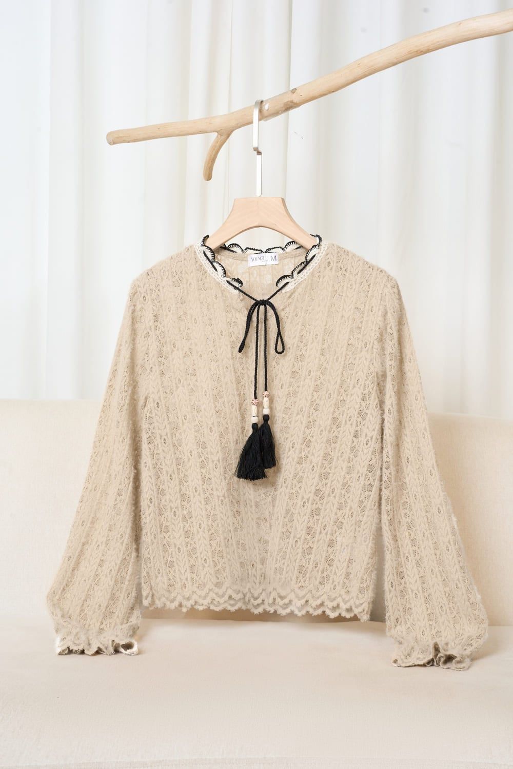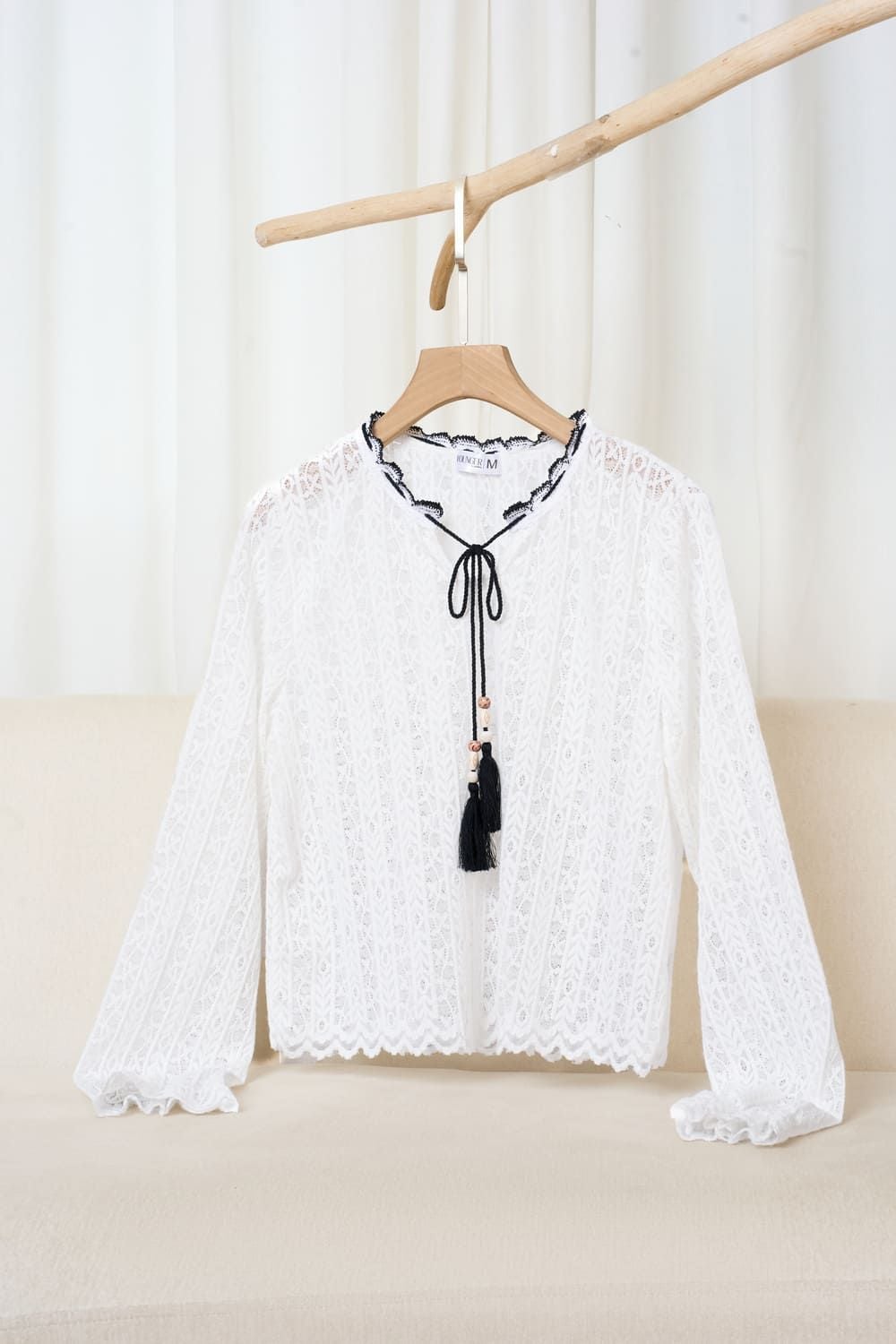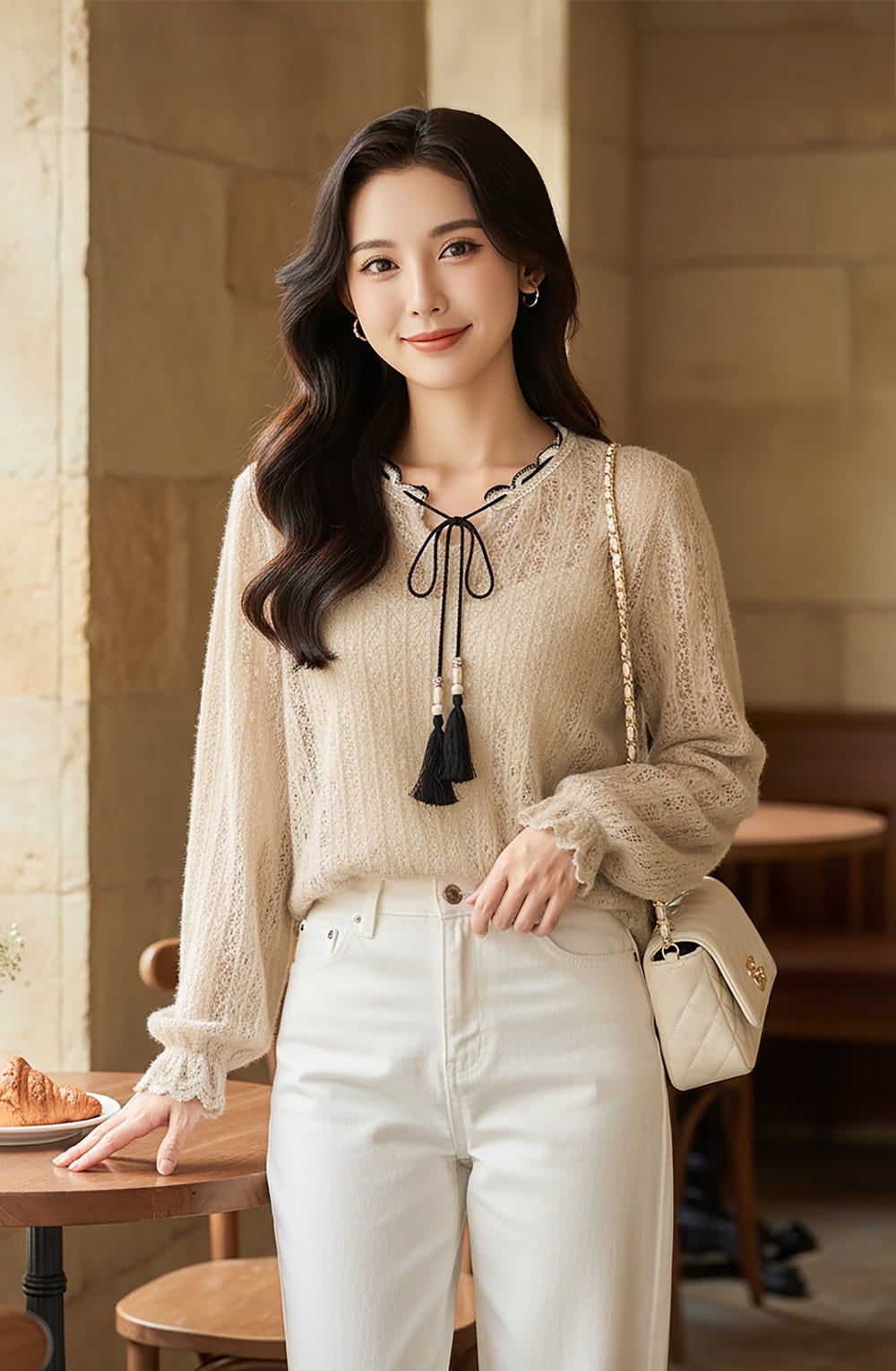 Áo kiểu nữ vải ren mềm tay dài phối cổ dây mộc
