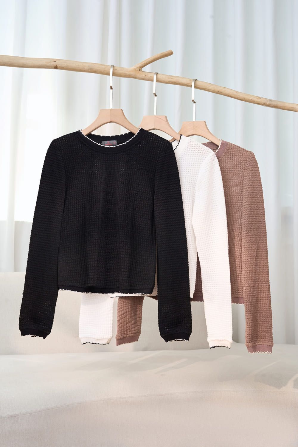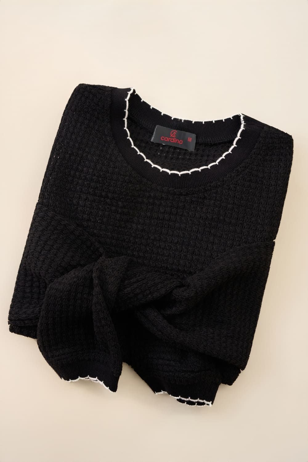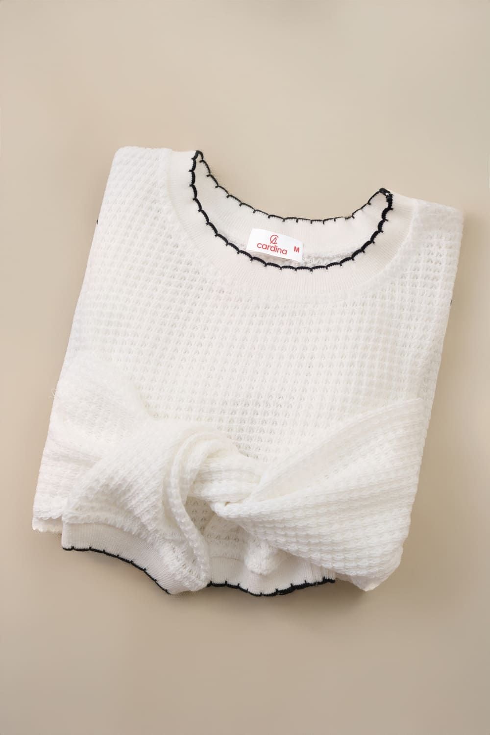 Áo len nữ dệt tổ ong dài tay cổ tròn phối viền