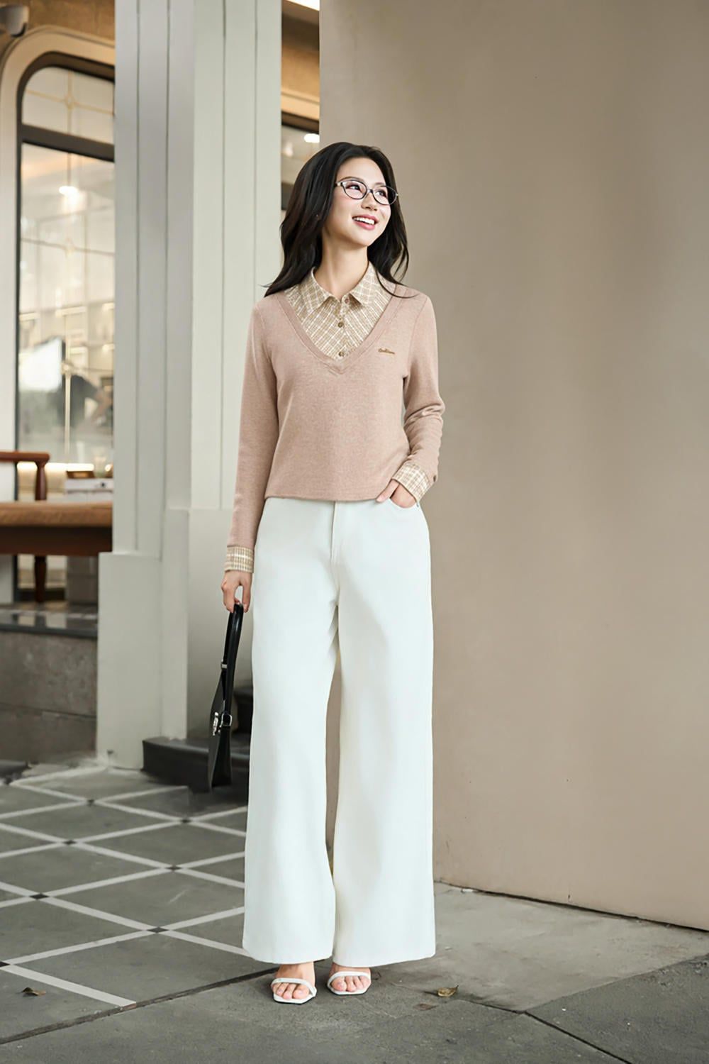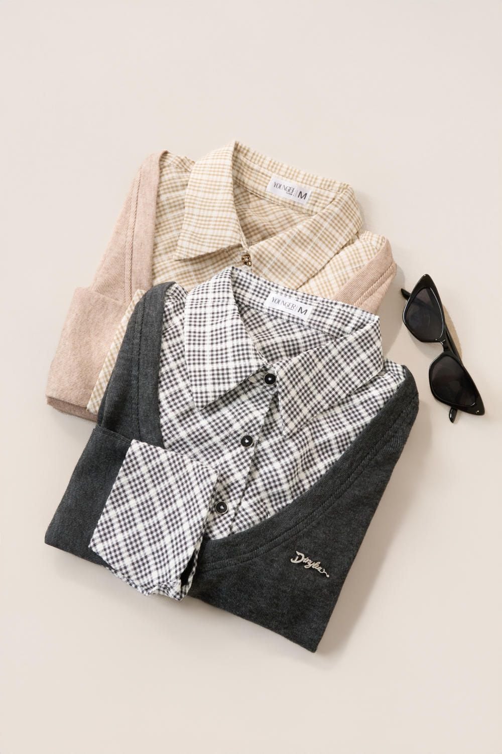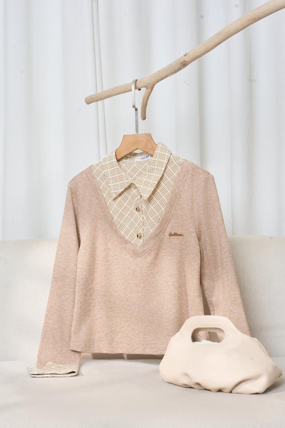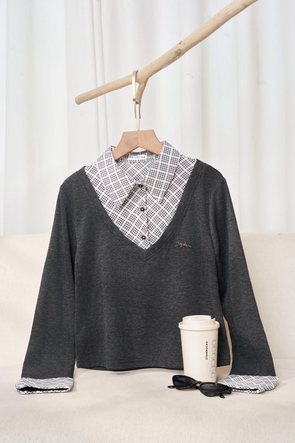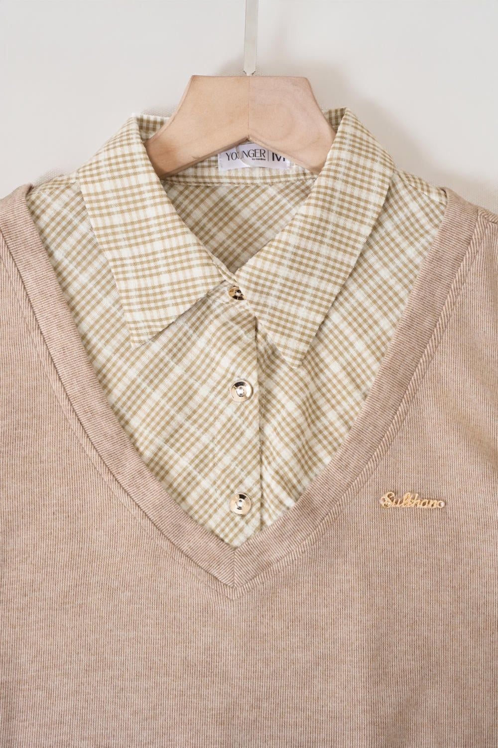 Áo nỉ tăm lông cừu phối cổ sơ mi kẻ họa tiết