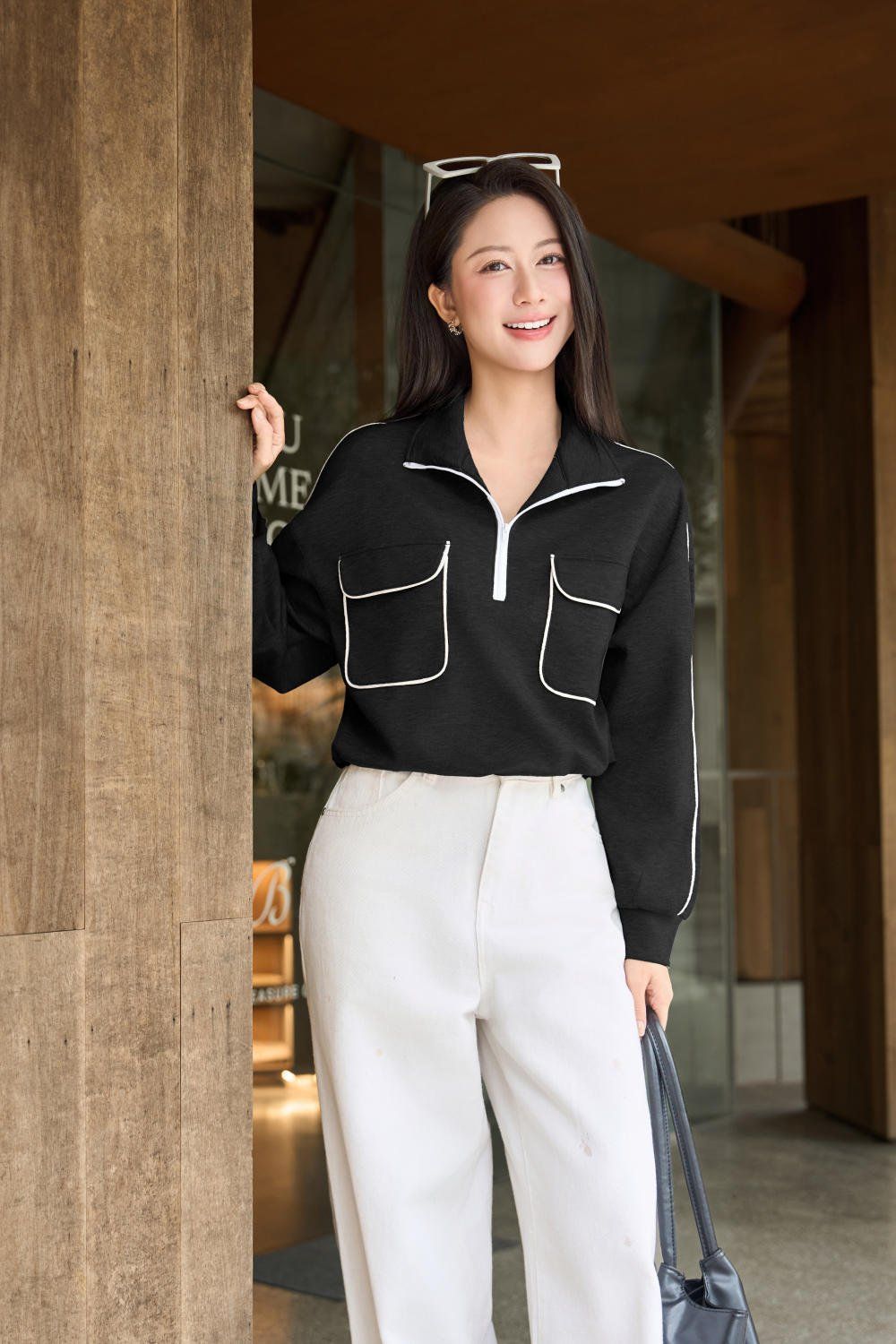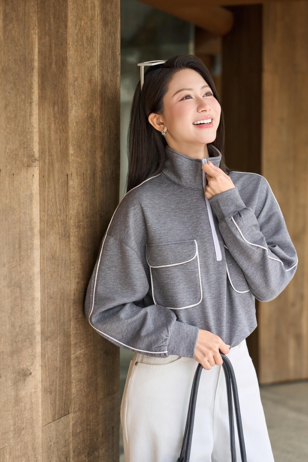 Áo Umi Mềm Giữ Ấm Túi Hộp Vai Chờm Cổ Khóa Zip Dáng Suông