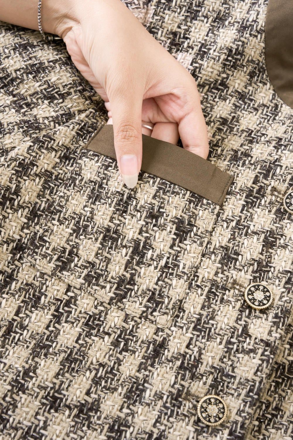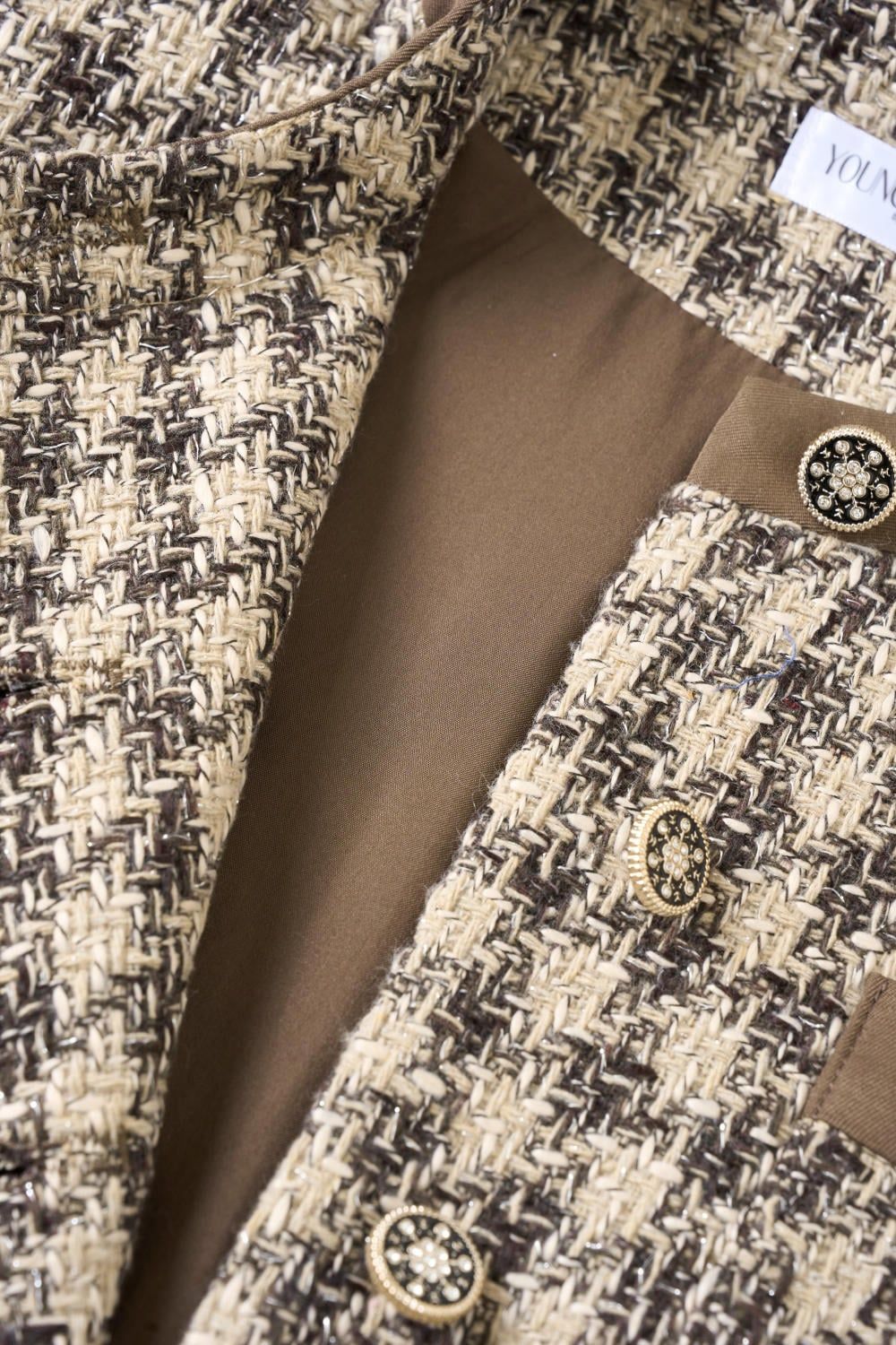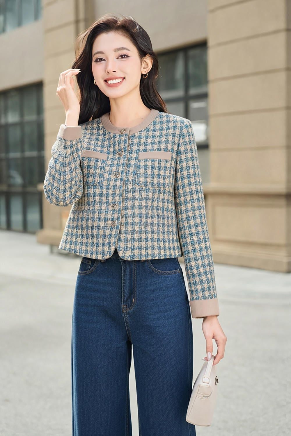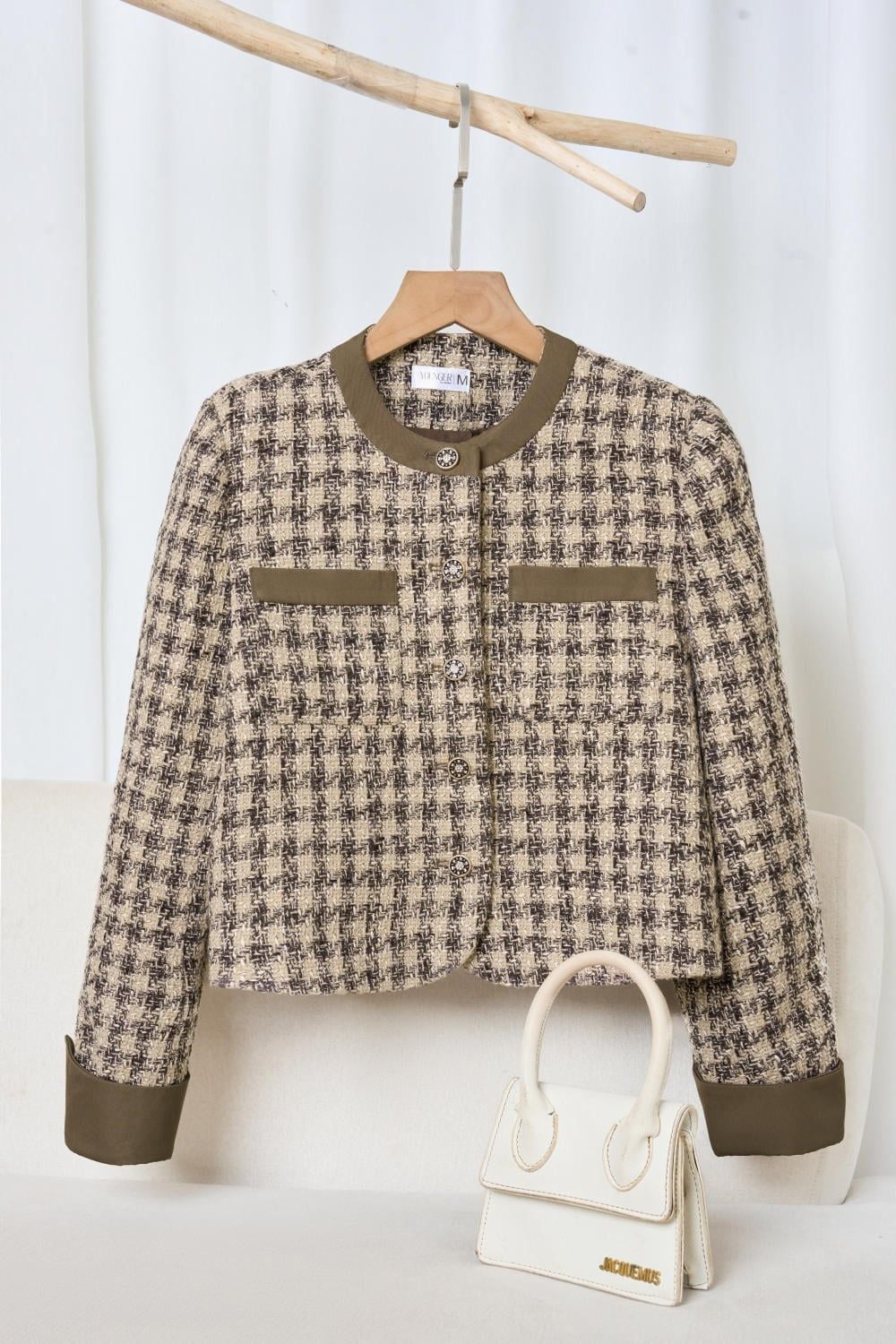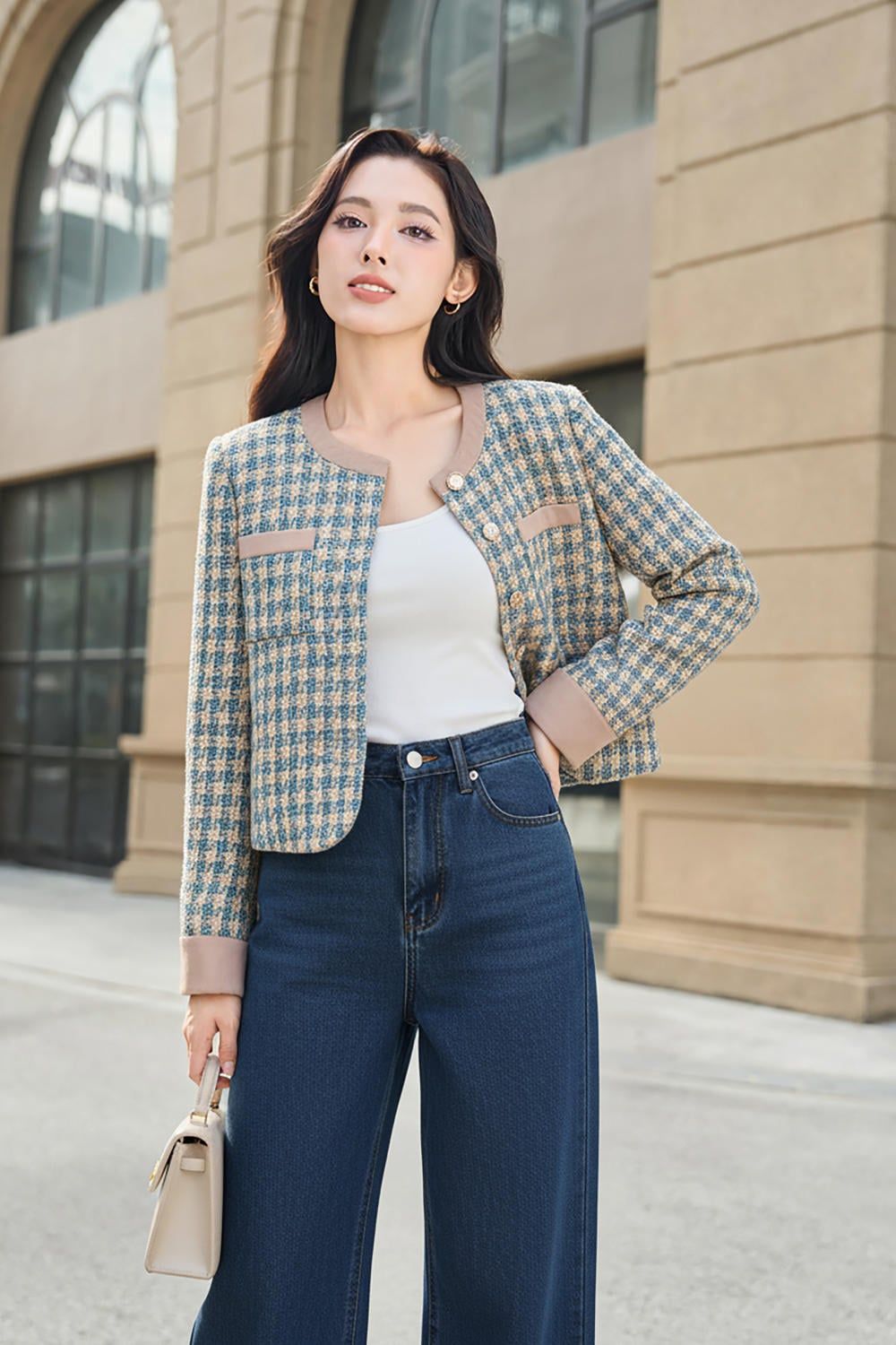 Áo khoác dạ Tweed dáng ngắn không cổ phối viền sang trọng