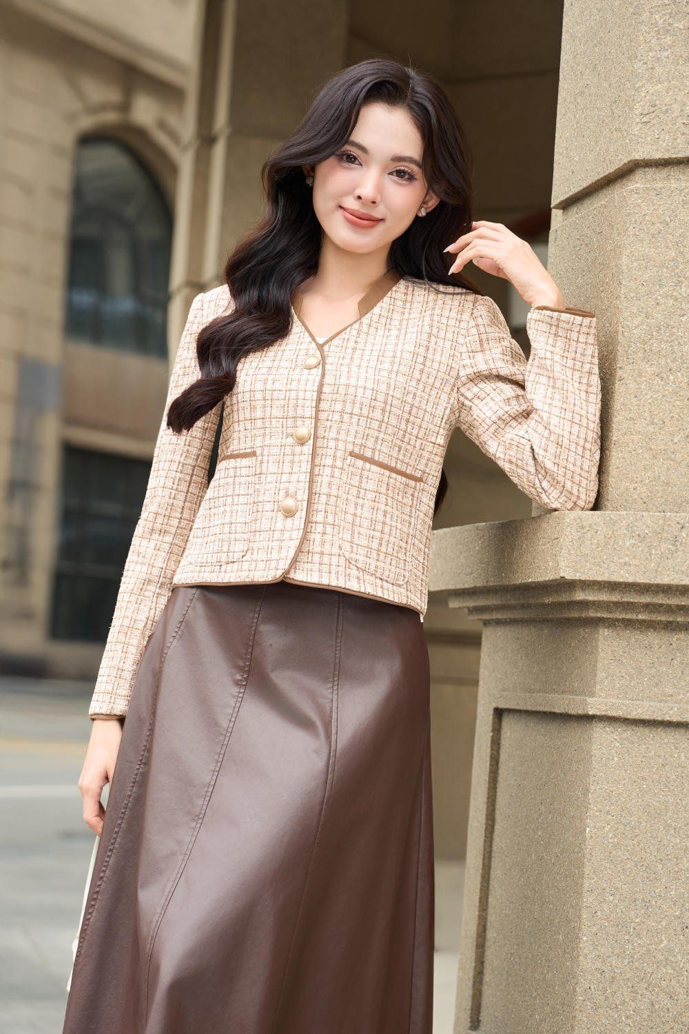 Áo Khoác Dạ Tweed Cao Cấp Viền Nổi Cổ Tàu Dáng Ngắn Sang Trọng