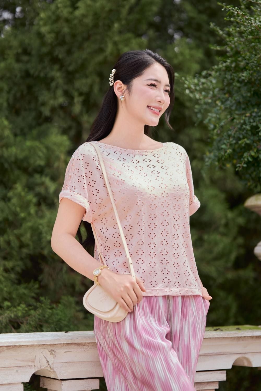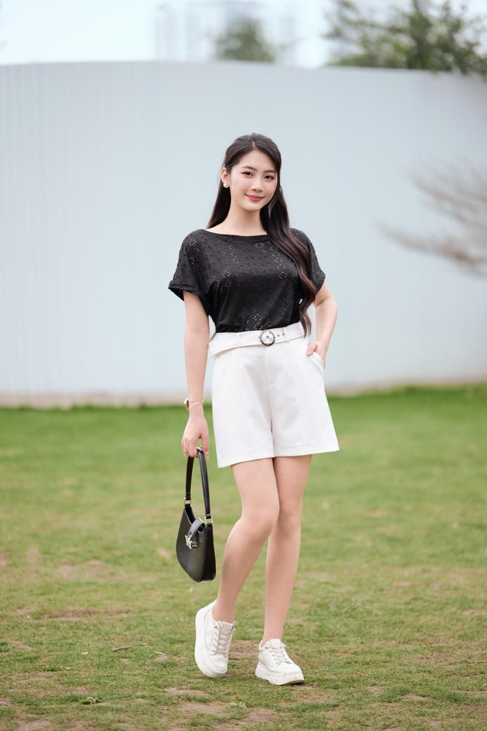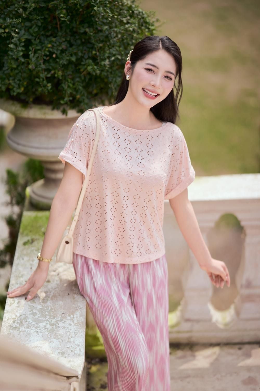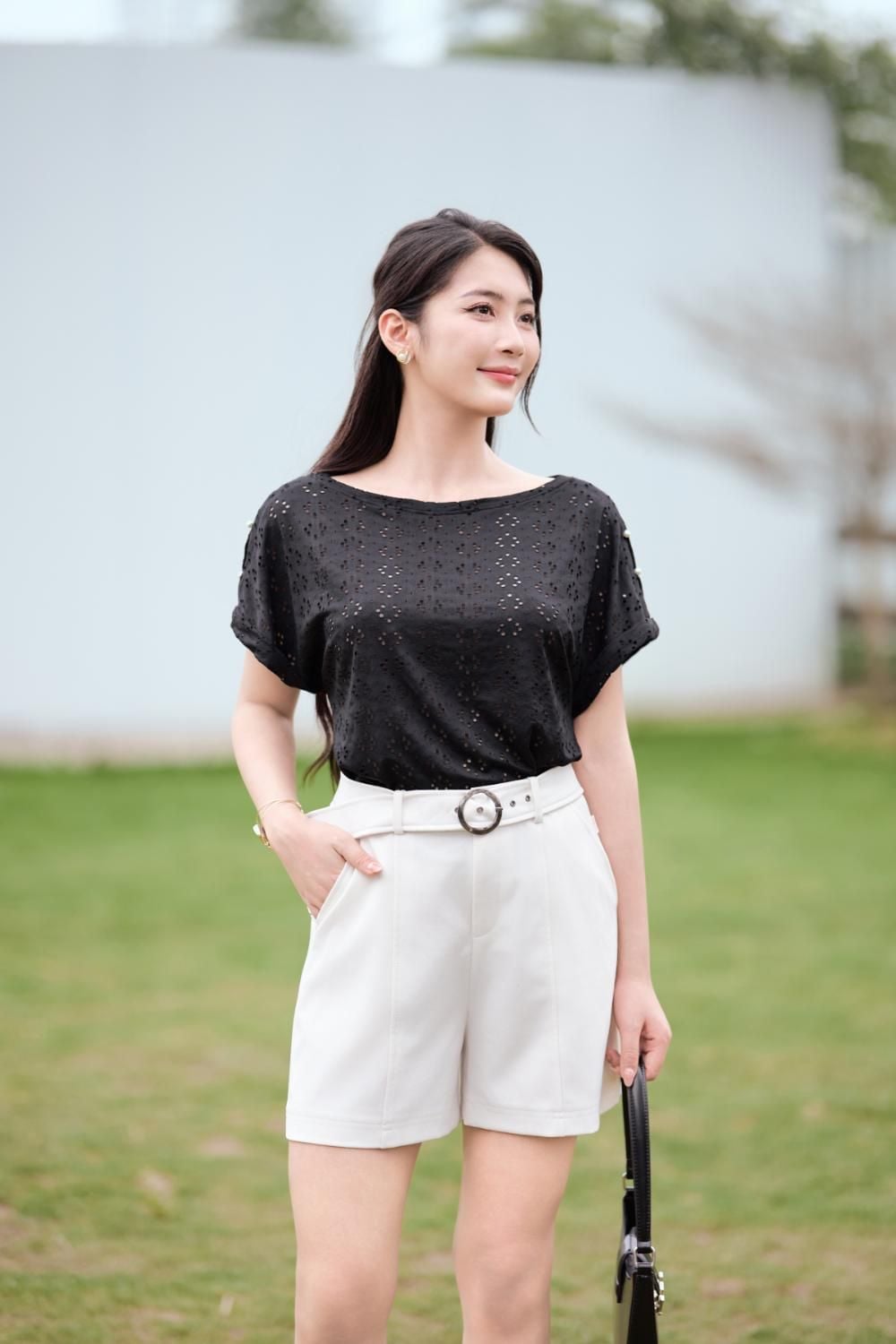 Áo phông nữ chất cotton thêu tay liền đính cúc ngọc trang trí vai