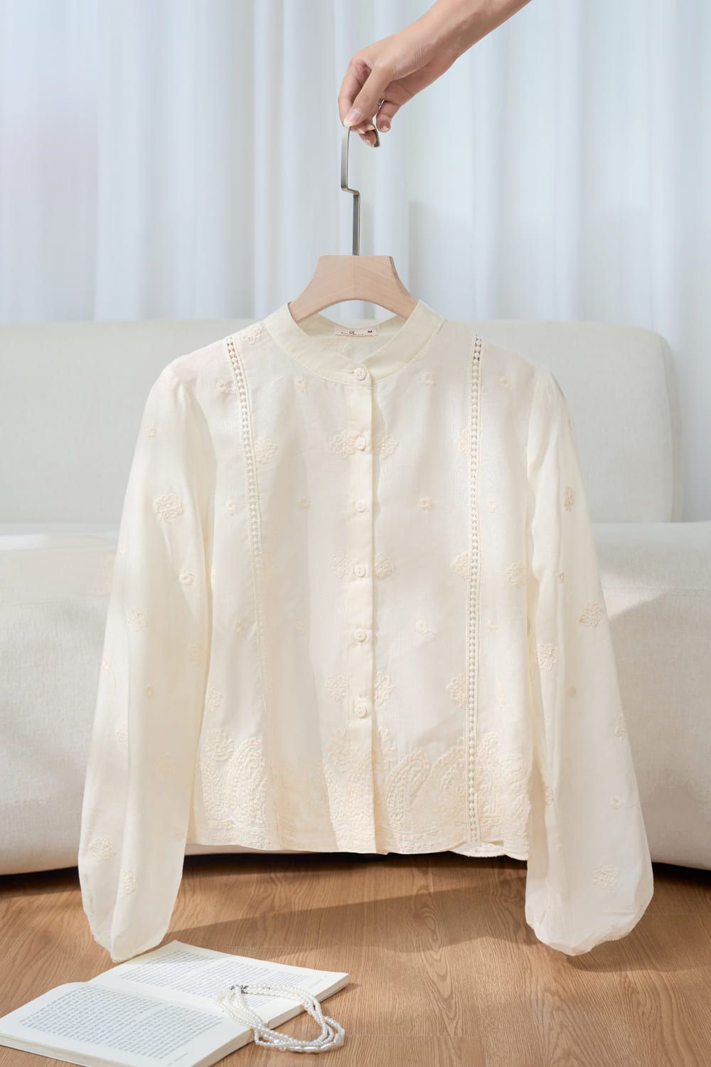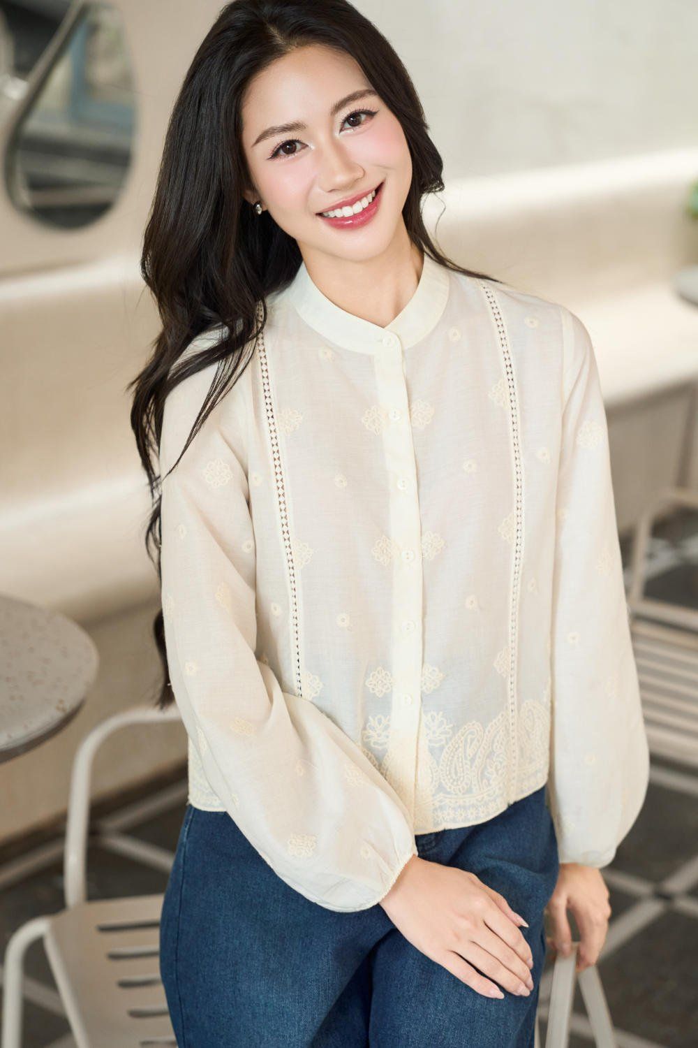 Áo sơ mi croptop cổ tàu tay chuông phối chun chất thô thêu