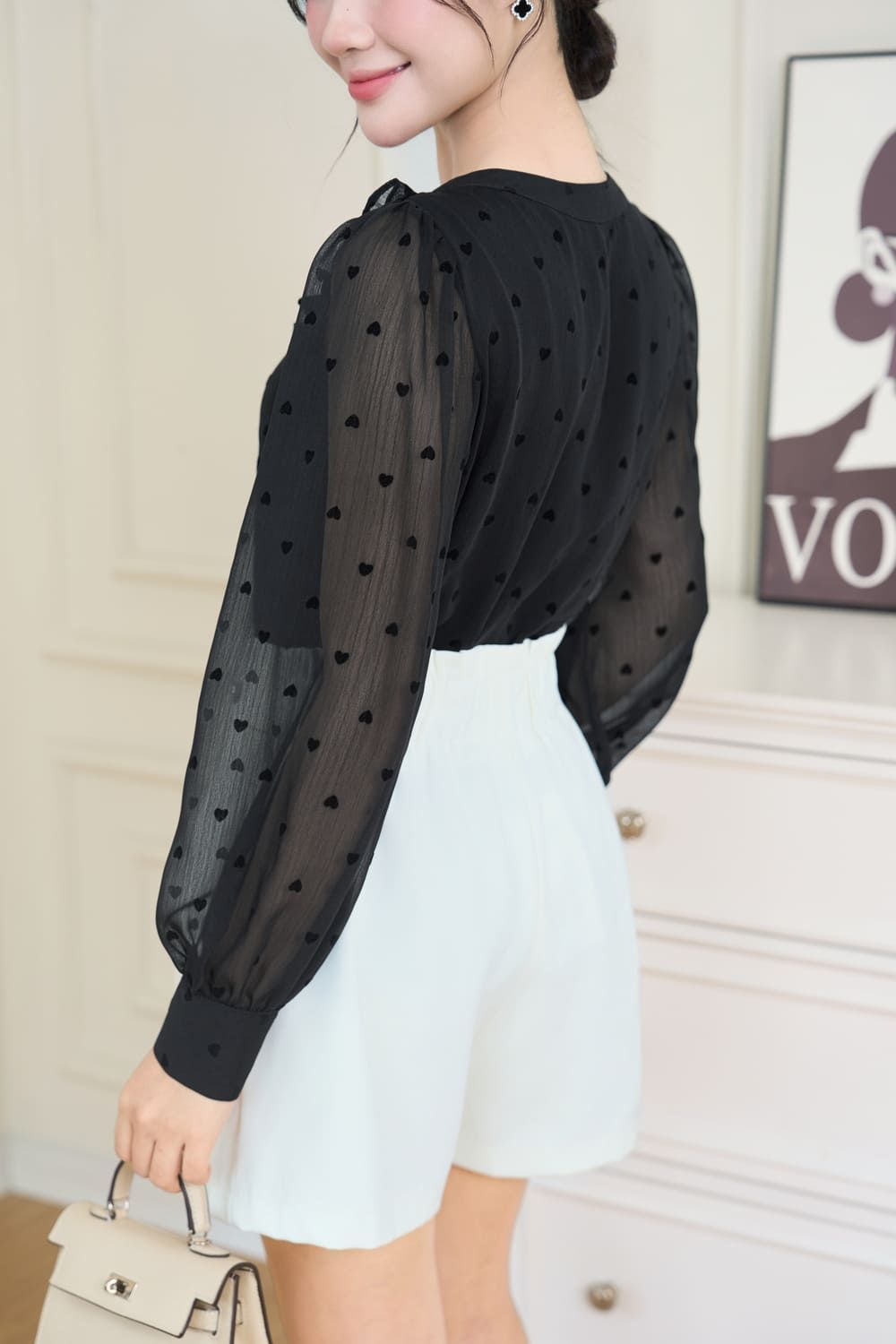 Áo Sơ Mi Nữ Dài Tay Vải Tơ Nhung Họa Tiết Tim Cổ V Phối Bèo