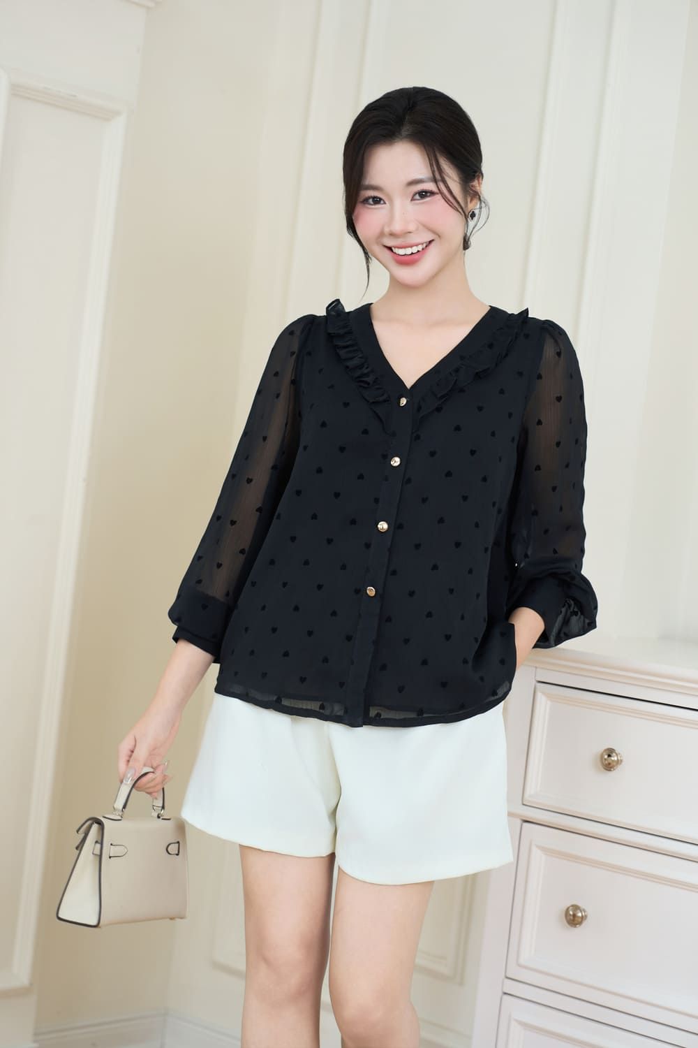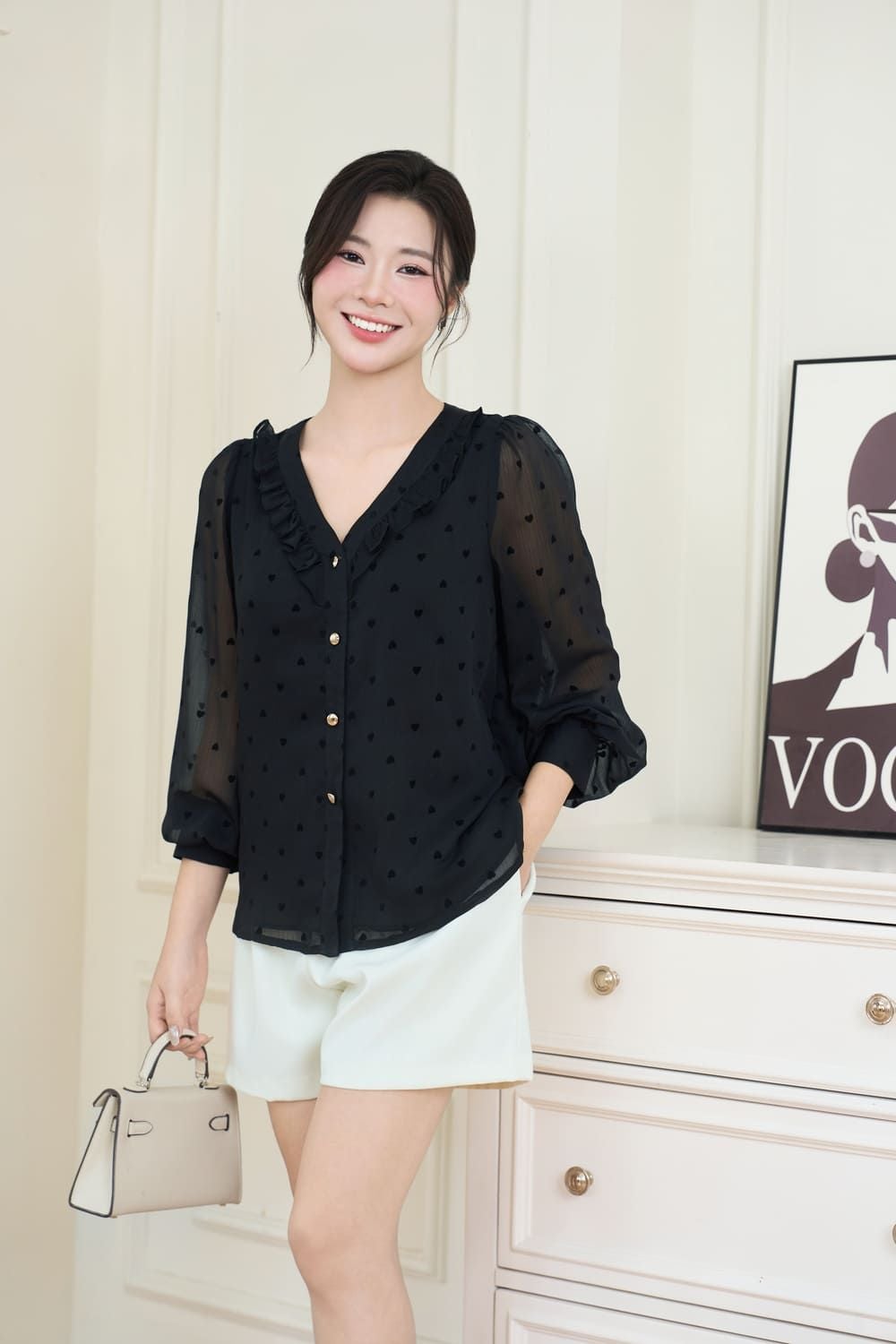 Dịu dàng và lãng mạn với Áo Sơ Mi Nữ Younger by Cardina! Chất liệu tơ nhung mềm mại, thoáng mát, cùng họa tiết trái tim nhỏ xinh, mang đến vẻ đẹp tinh tế và nữ tính. Thiết kế cổ V phối bèo độc đáo và tay dài thanh lịch, phù hợp cho nhiều dịp từ công sở đến dạo phố. Dễ dàng phối cùng chân váy midi, quần âu hoặc quần jean để tạo nên set đồ đa phong cách. Sản phẩm có sẵn các size M, L, XL. Sắm ngay để thêm nét duyên dáng vào tủ đồ của bạn!