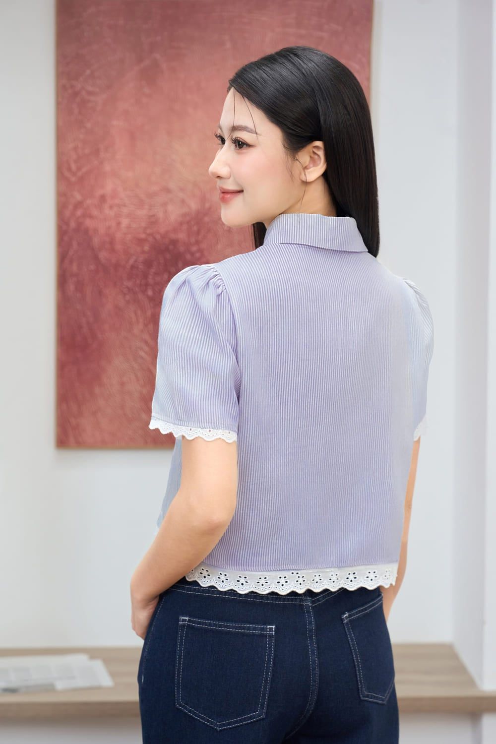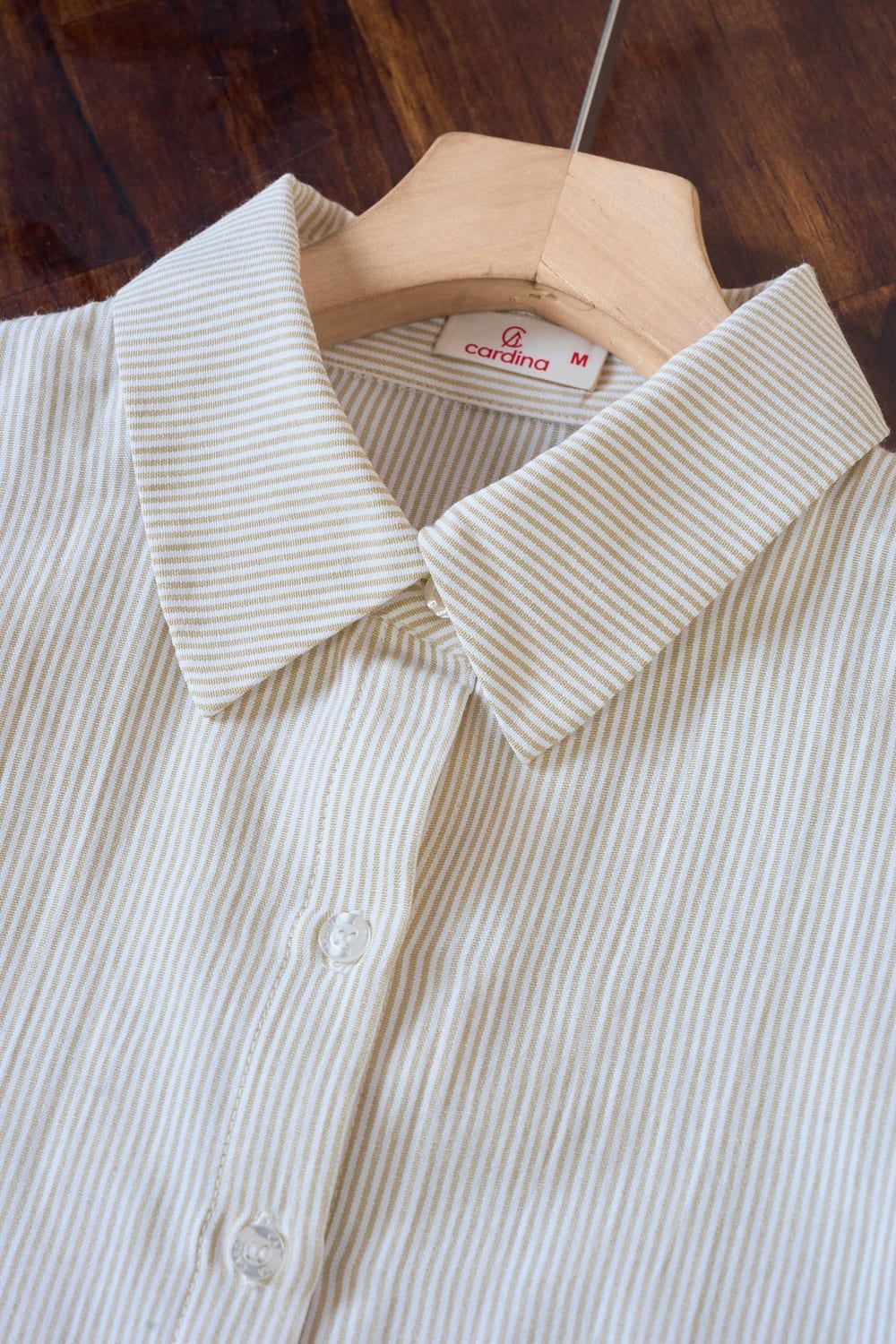 Áo sơ mi vải thô kẻ tay cộc phối gấu thêu hoa