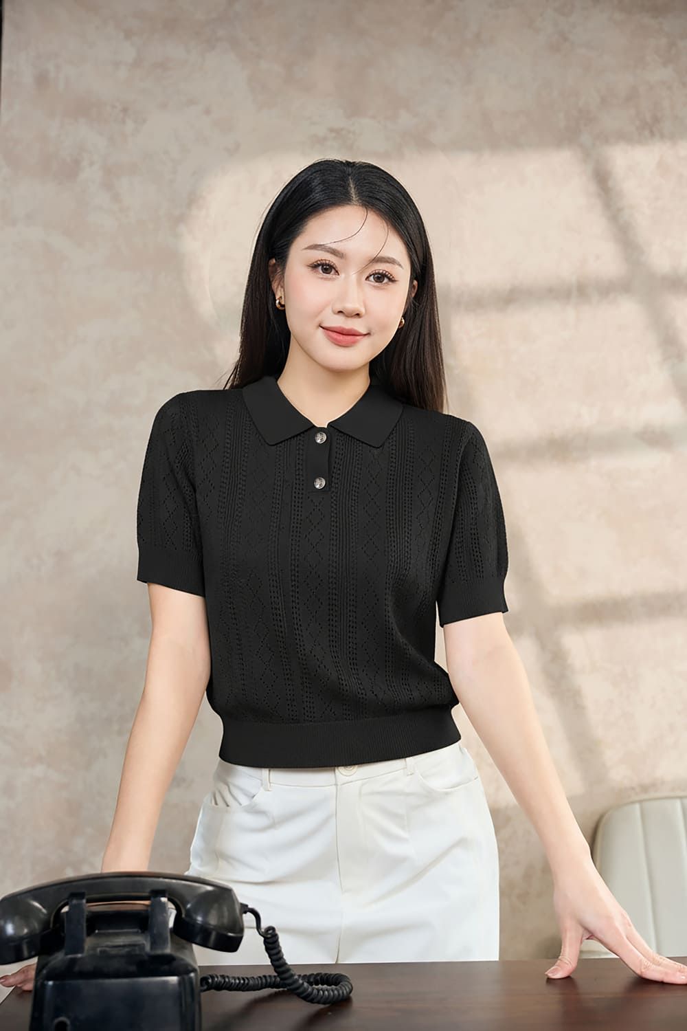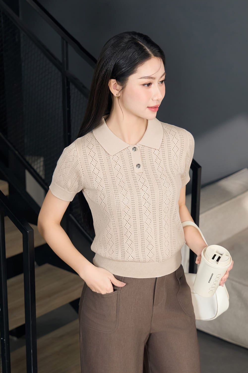 Áo len cotton dệt kim tay cộc cổ Polo họa tiết trám