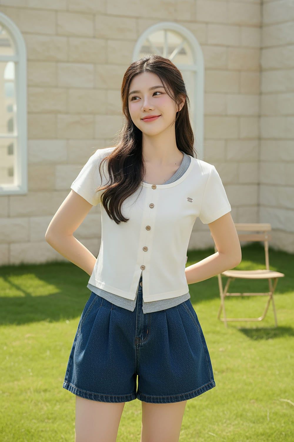 Áo cotton tay cộc cổ tròn thiết kế phối giả 2 lớp trẻ trung