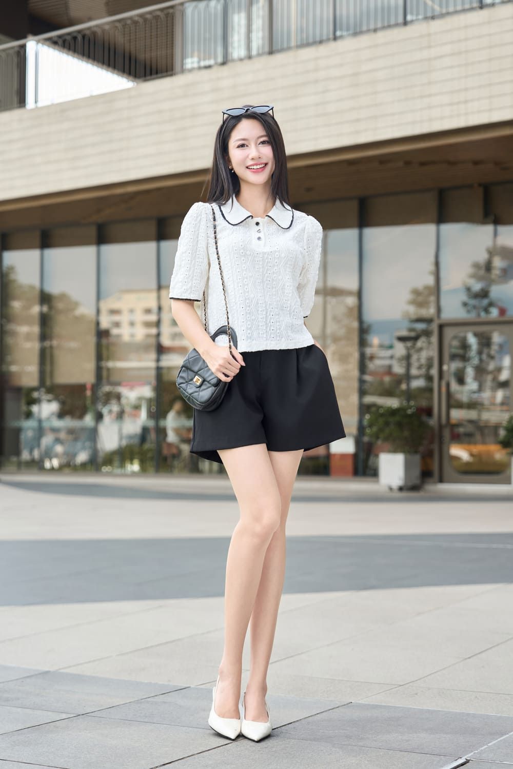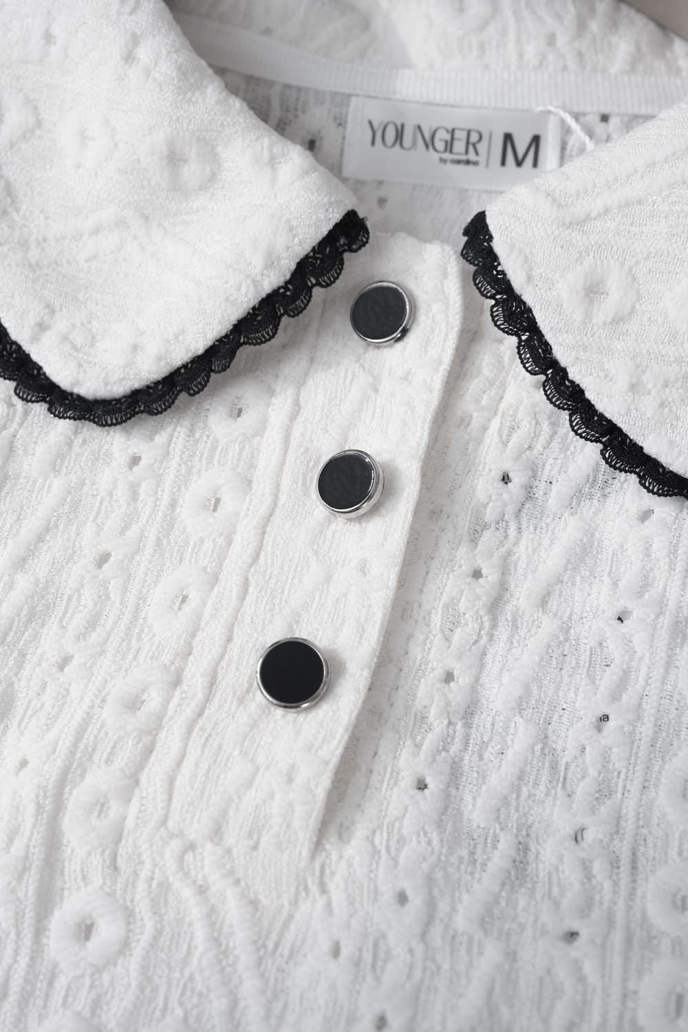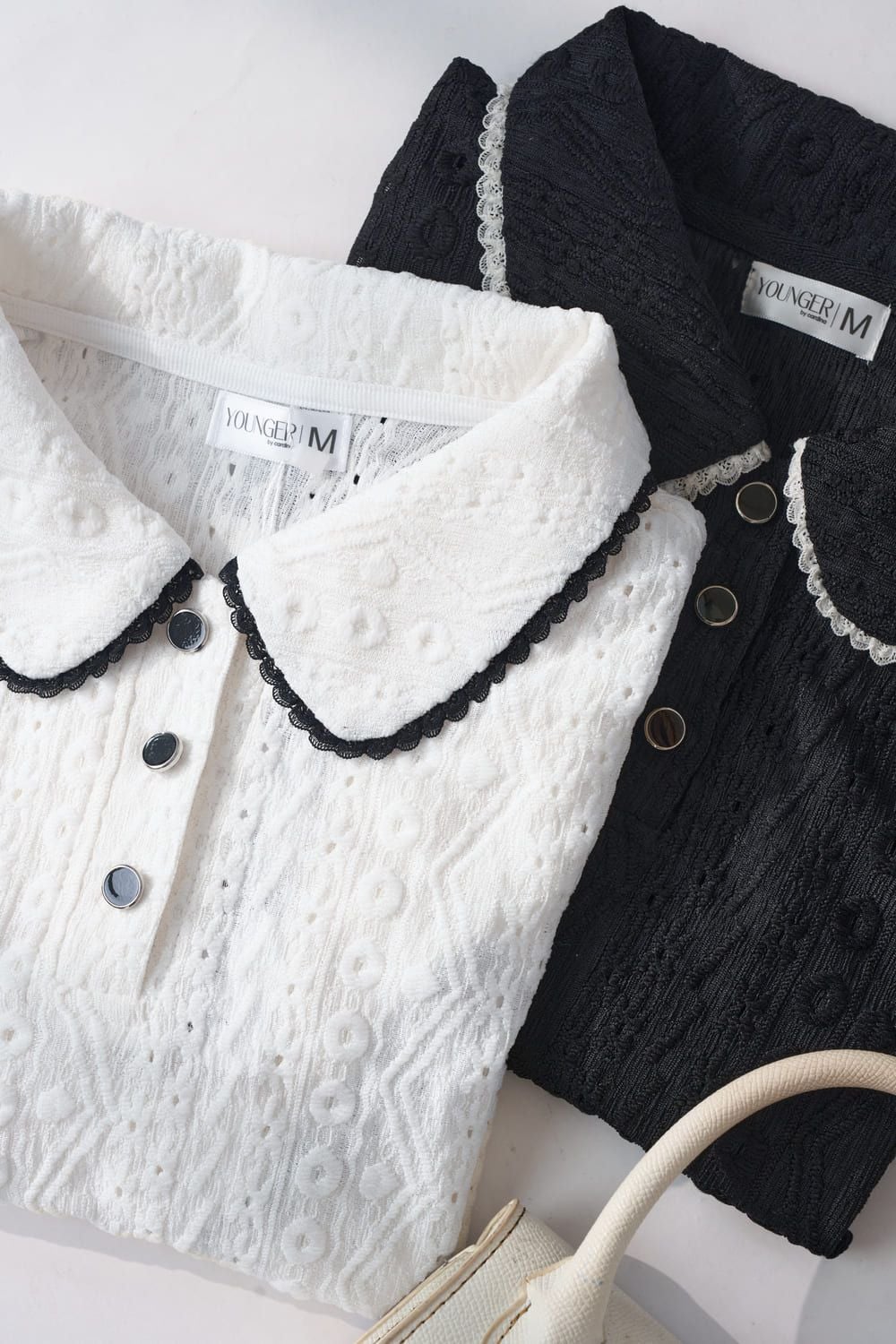 Áo len dệt của Cardina mang đến vẻ ngoài ngọt ngào, nữ tính và tinh tế. Chất liệu len dệt giả ren mềm mại, có độ thoáng khí, tạo cảm giác thoải mái khi mặc. Thiết kế tay lỡ trẻ trung, điểm nhấn là cổ sen (Peter Pan) duyên dáng, kết hợp chi tiết phối viền ren tương phản nổi bật. Áo có hàng cúc cài tiện lợi, dễ dàng phối cùng chân váy hoặc quần âu để đi làm, dạo phố.