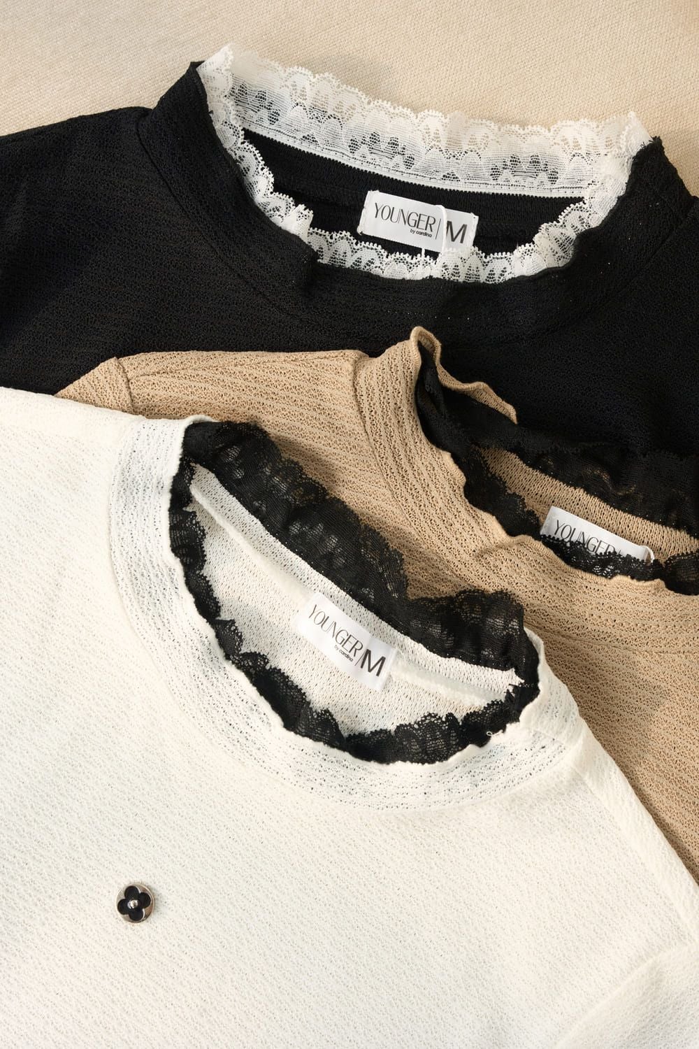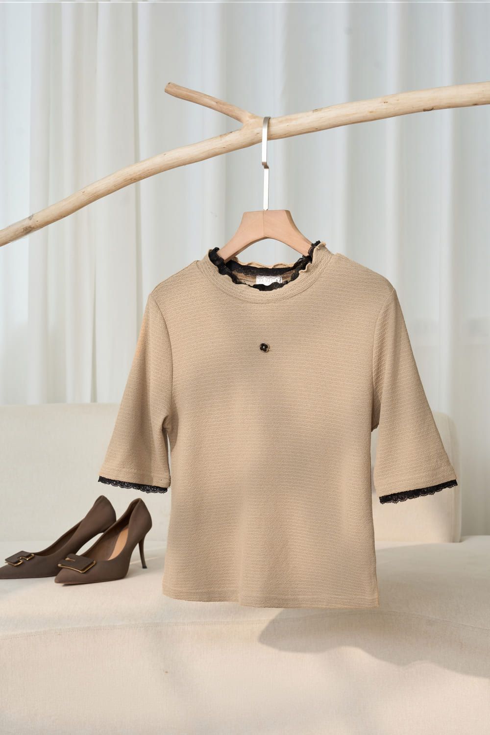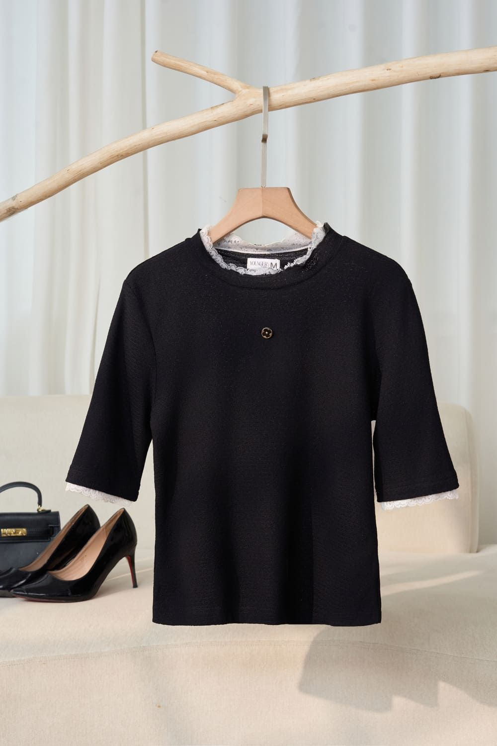 Áo nữ vải len xốp dáng tay lỡ cổ tròn phối viền ren