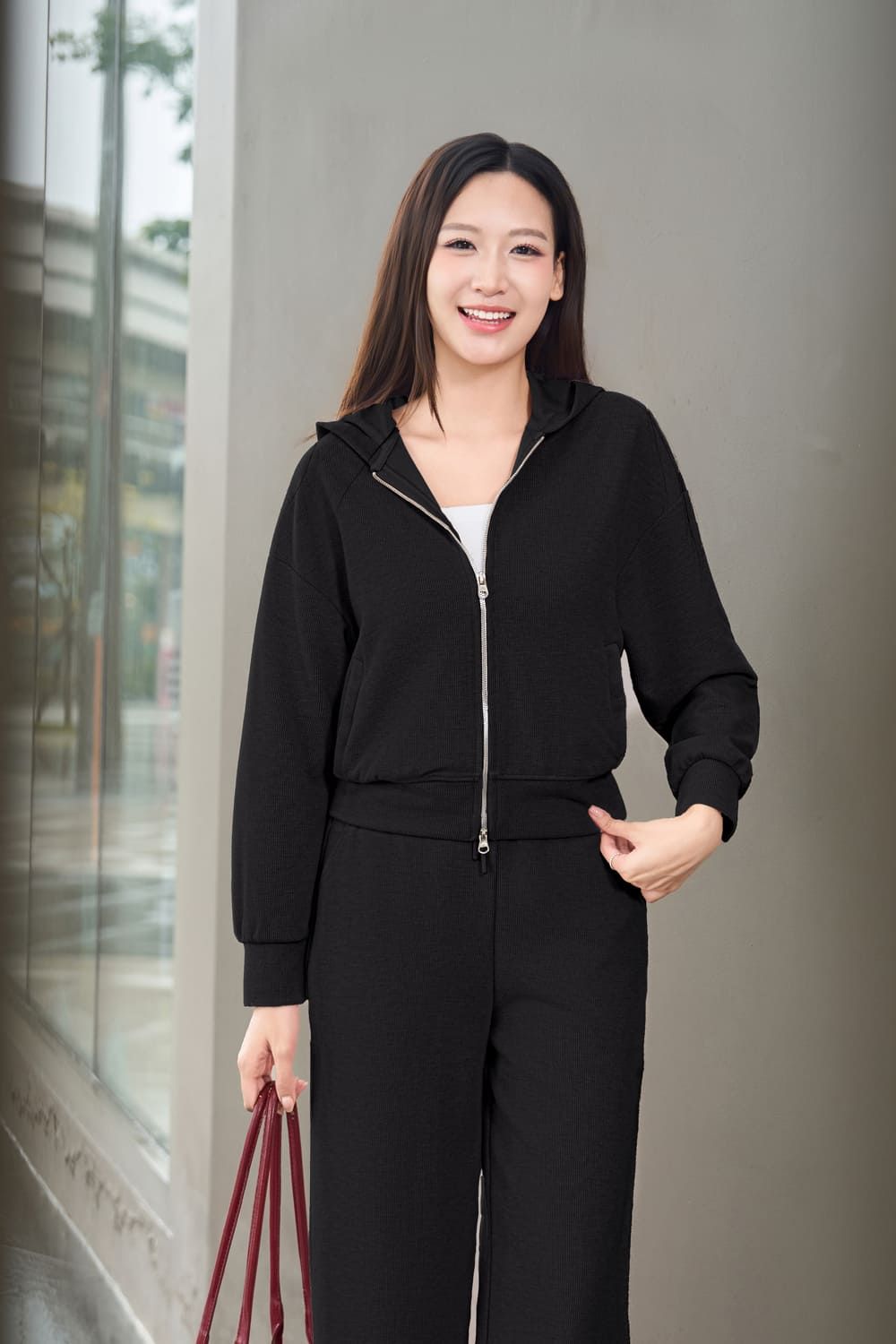 Áo khoác thể thao Cardina vải nỉ tăm dáng suông lửng có mũ khóa kéo