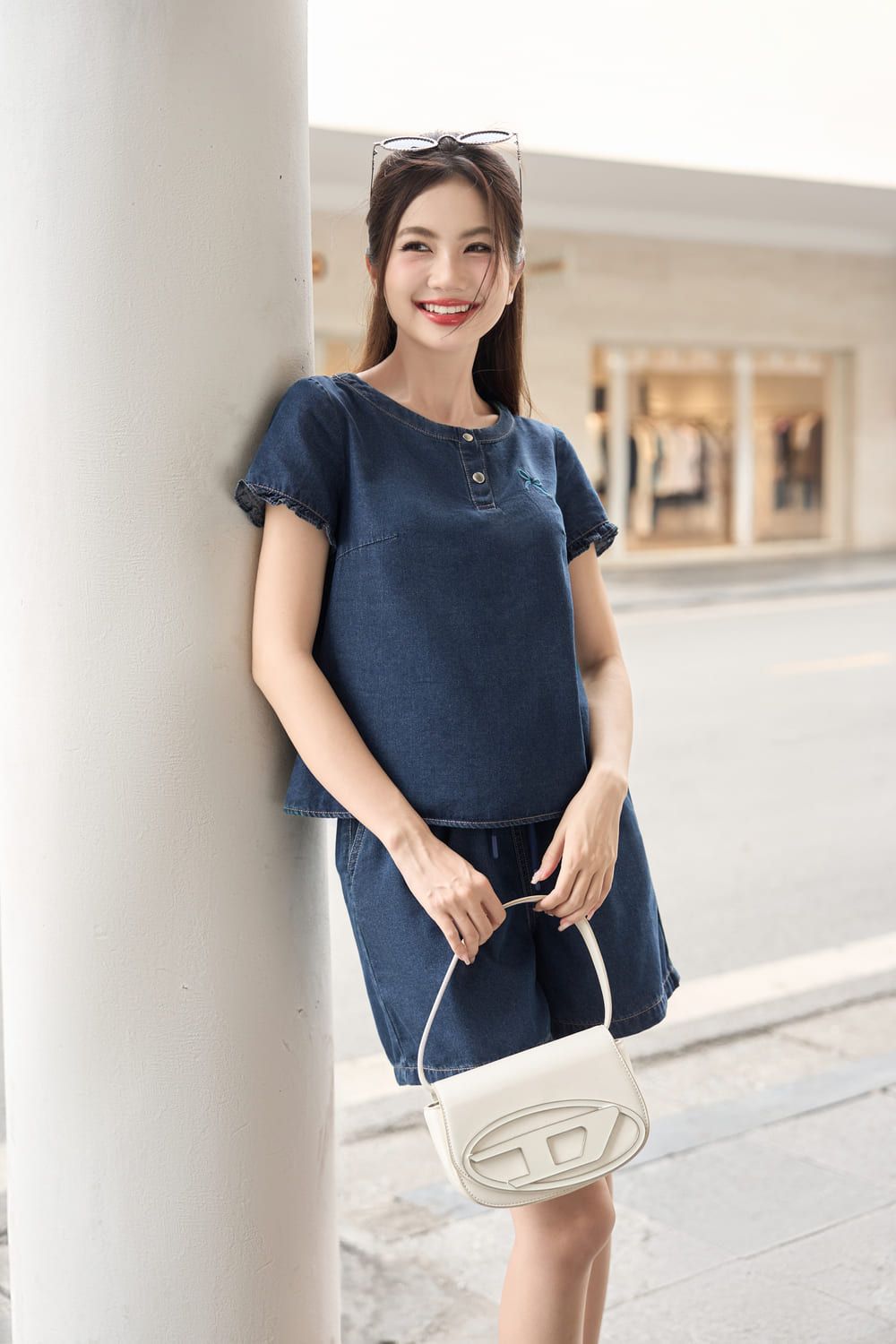 Đồ mặc nhà dáng đùi phối áo cổ trụ tròn chất bò giấy cao cấp