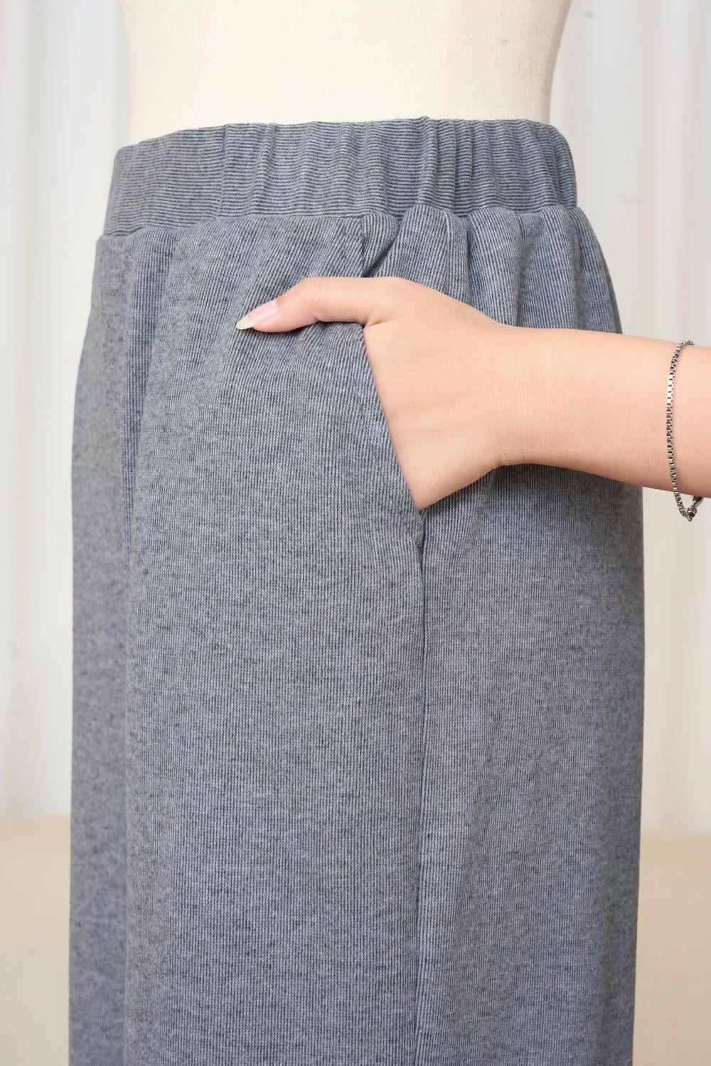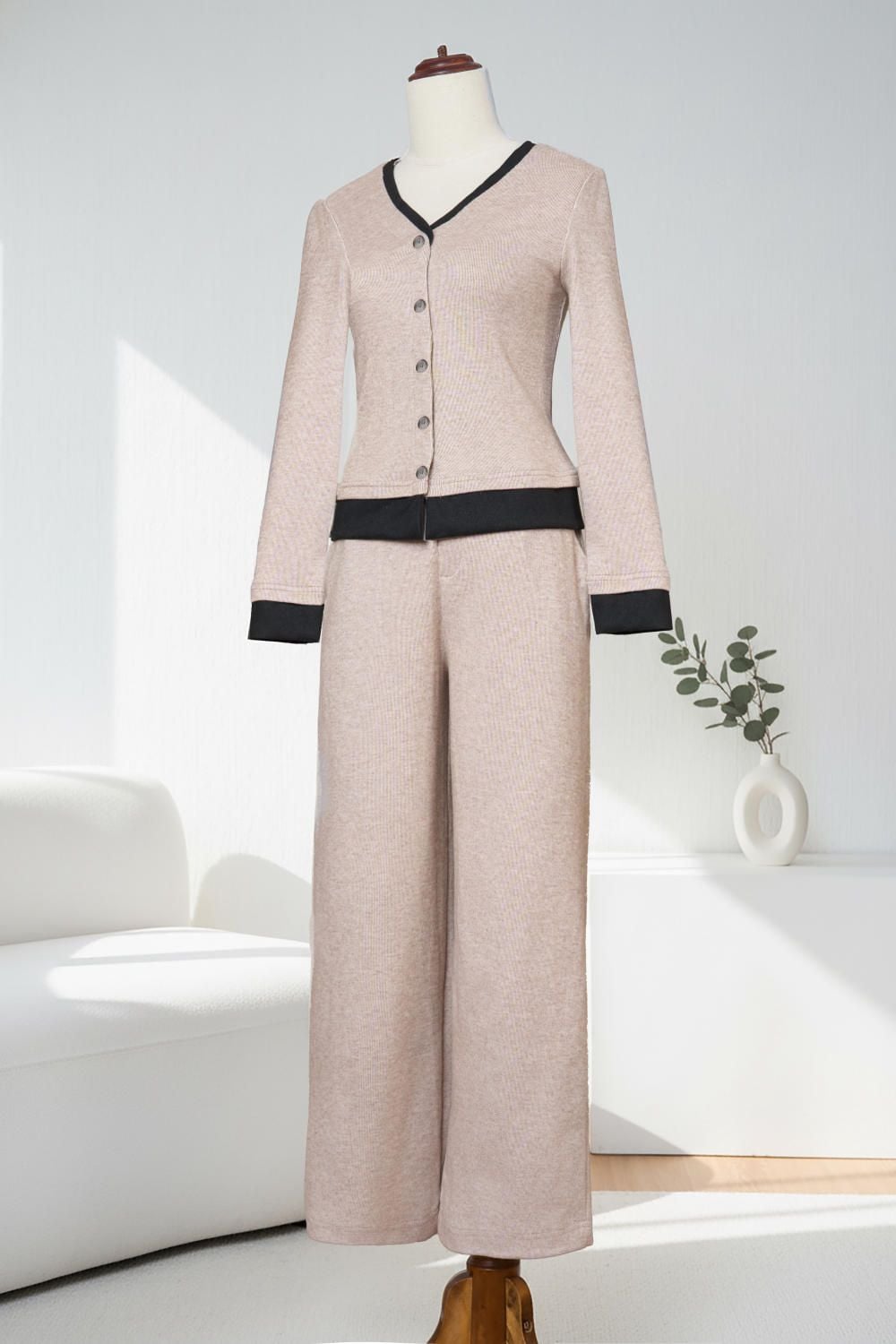 Bộ đồ nữ nỉ lông cừu áo cổ tim phối viền quần suông