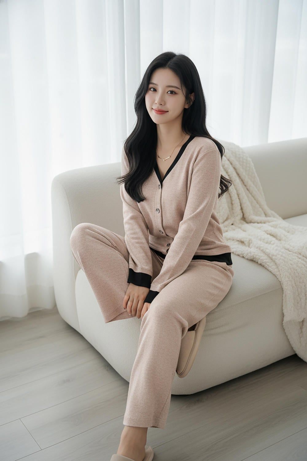 Bộ đồ thu đông cao cấp sử dụng chất nỉ lông cừu dày dặn, bề mặt vải êm ái. Thiết kế áo cổ tim phối viền màu tương phản trẻ trung, kết hợp quần suông cạp chun co giãn thoải mái và có túi tiện lợi. Size S-XL (40-64kg). Sắm ngay để tận hưởng sự ấm áp và sành điệu tại nhà!