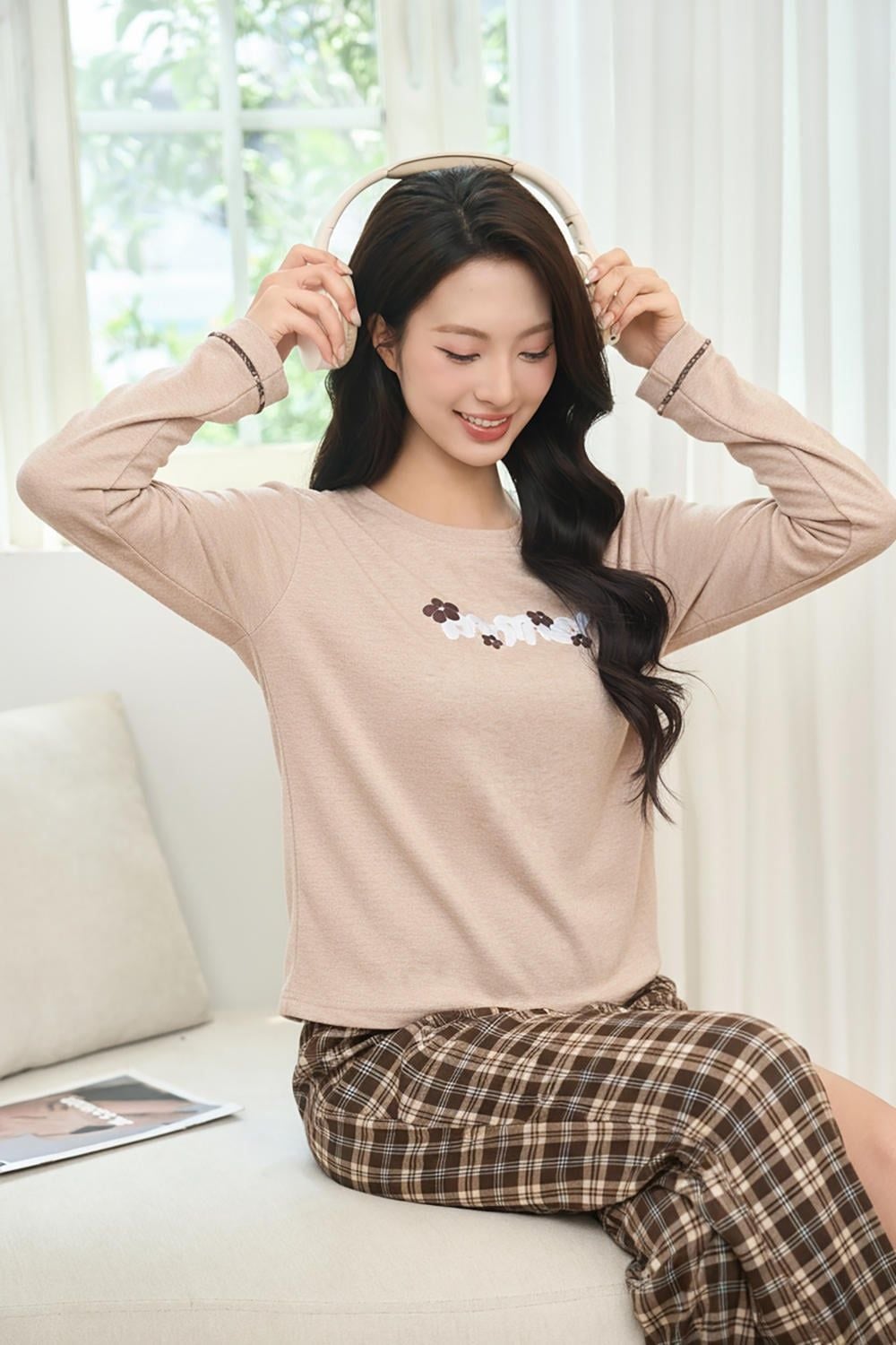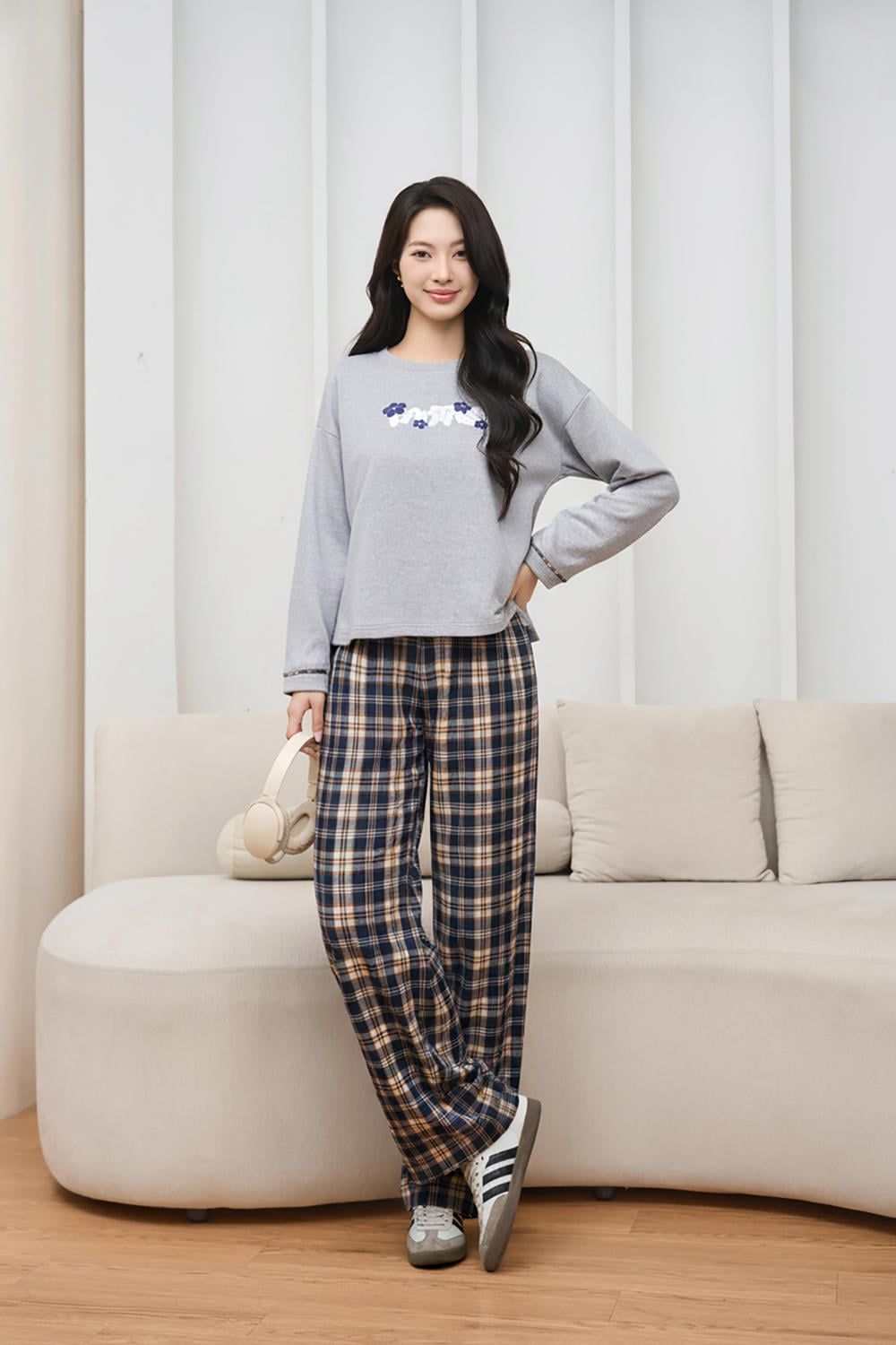 Bộ dài tay thu đông áo nỉ lông cừu phối quần kẻ suông