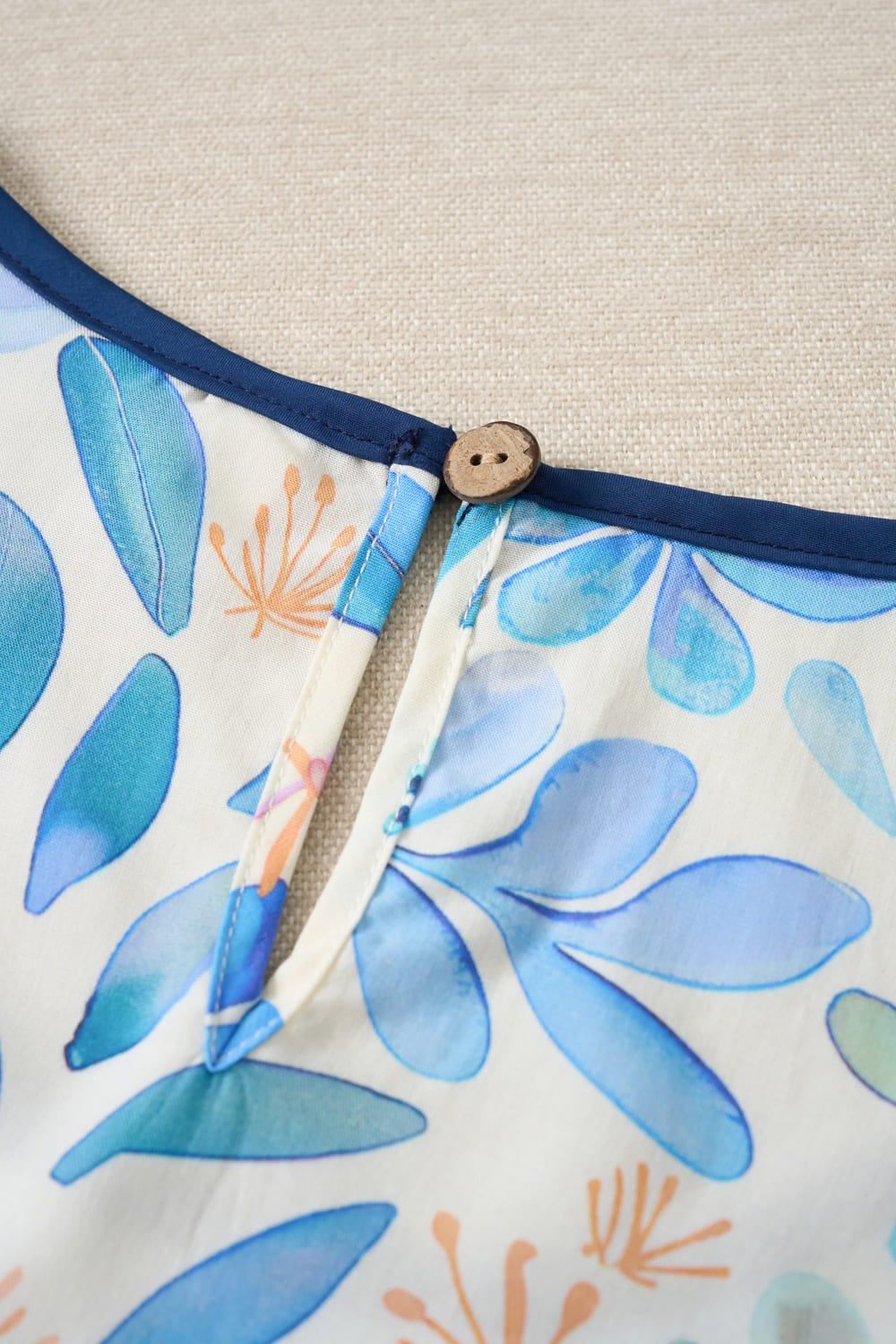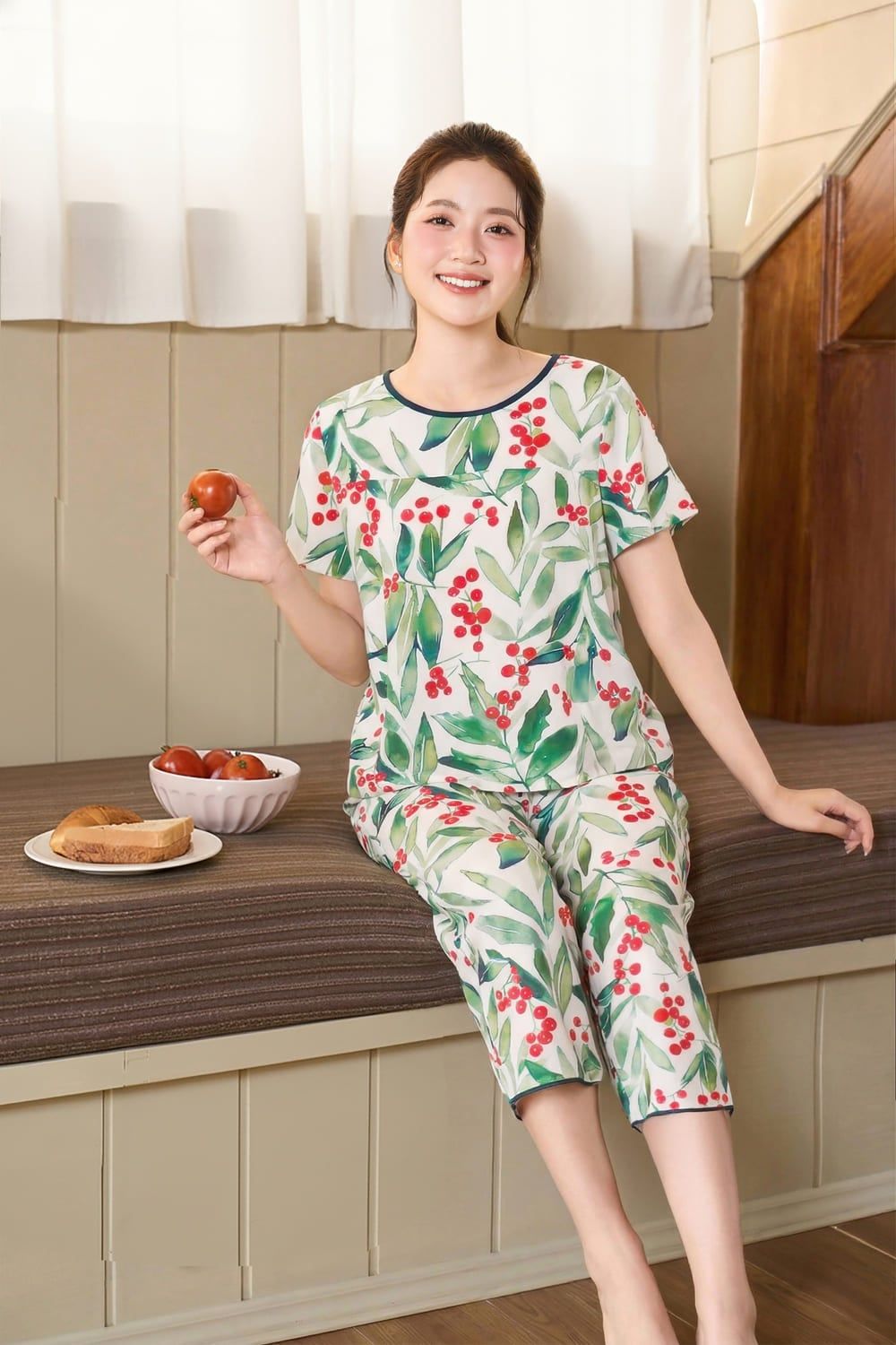 Bộ đồ lanh lửng nữ tay cộc cổ tròn họa tiết lá