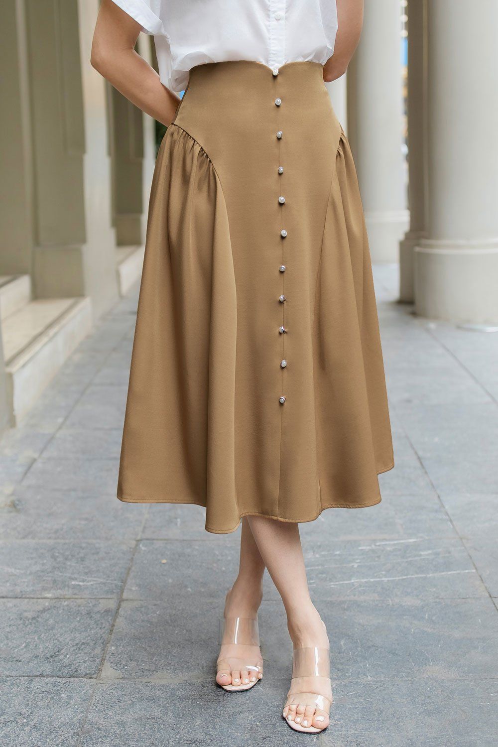 Chân váy công sở cạp cao dáng dài nhún hông.