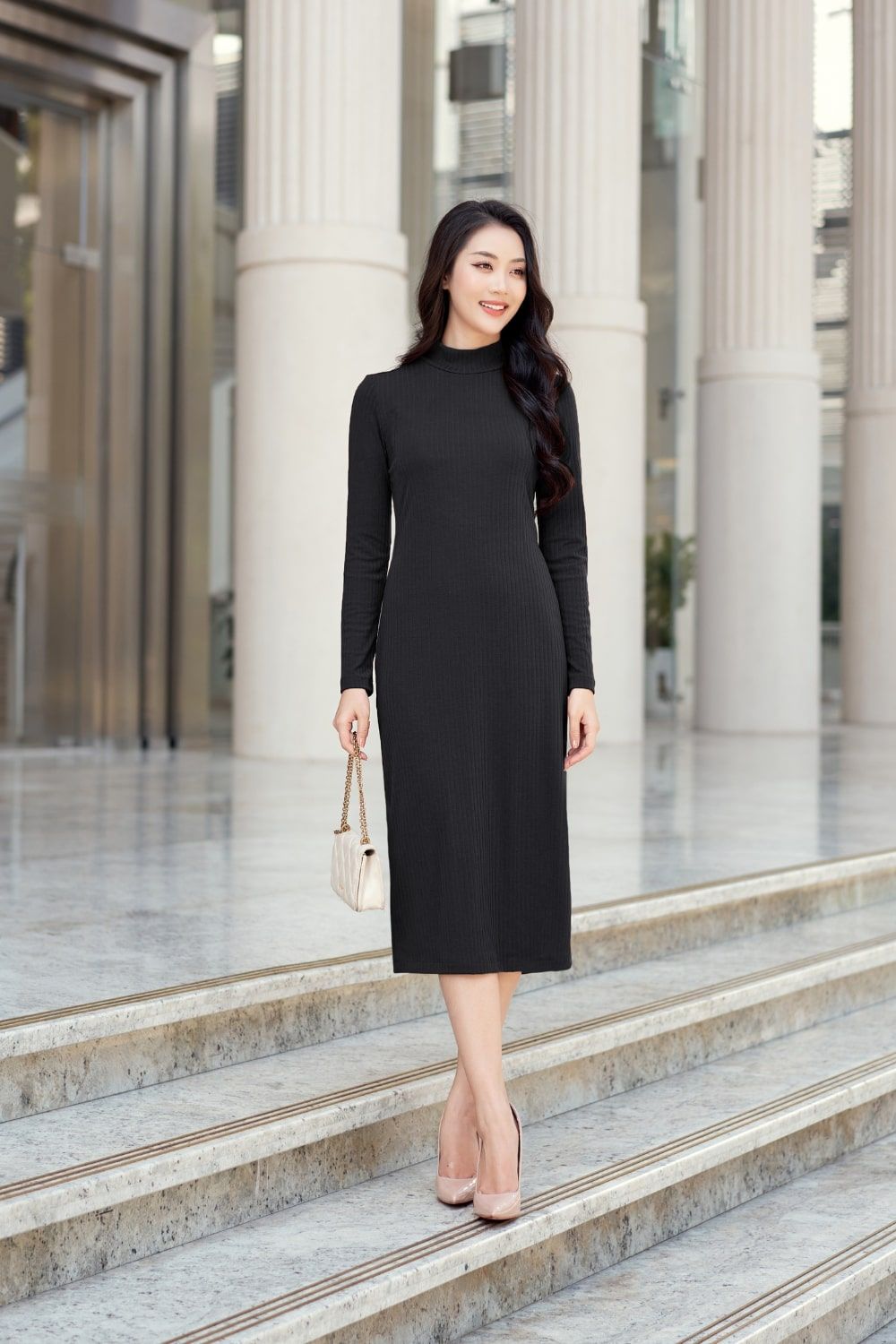 Đầm len gân dài tay cổ lọ thiết kế Cardina chính hãng