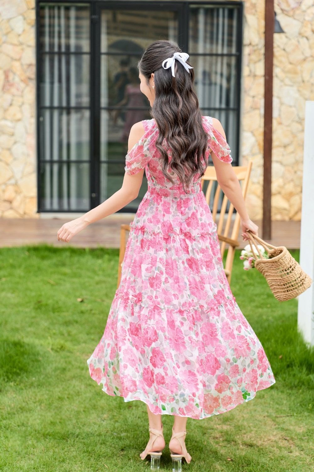 Đầm hở vai maxi vai bèo hoa nhí chất liệu tơ xước mềm mại