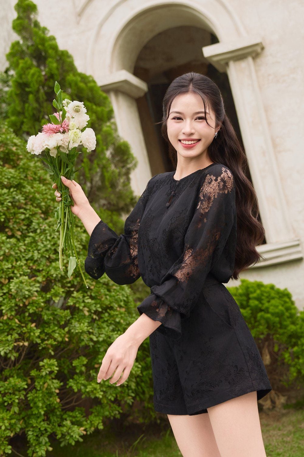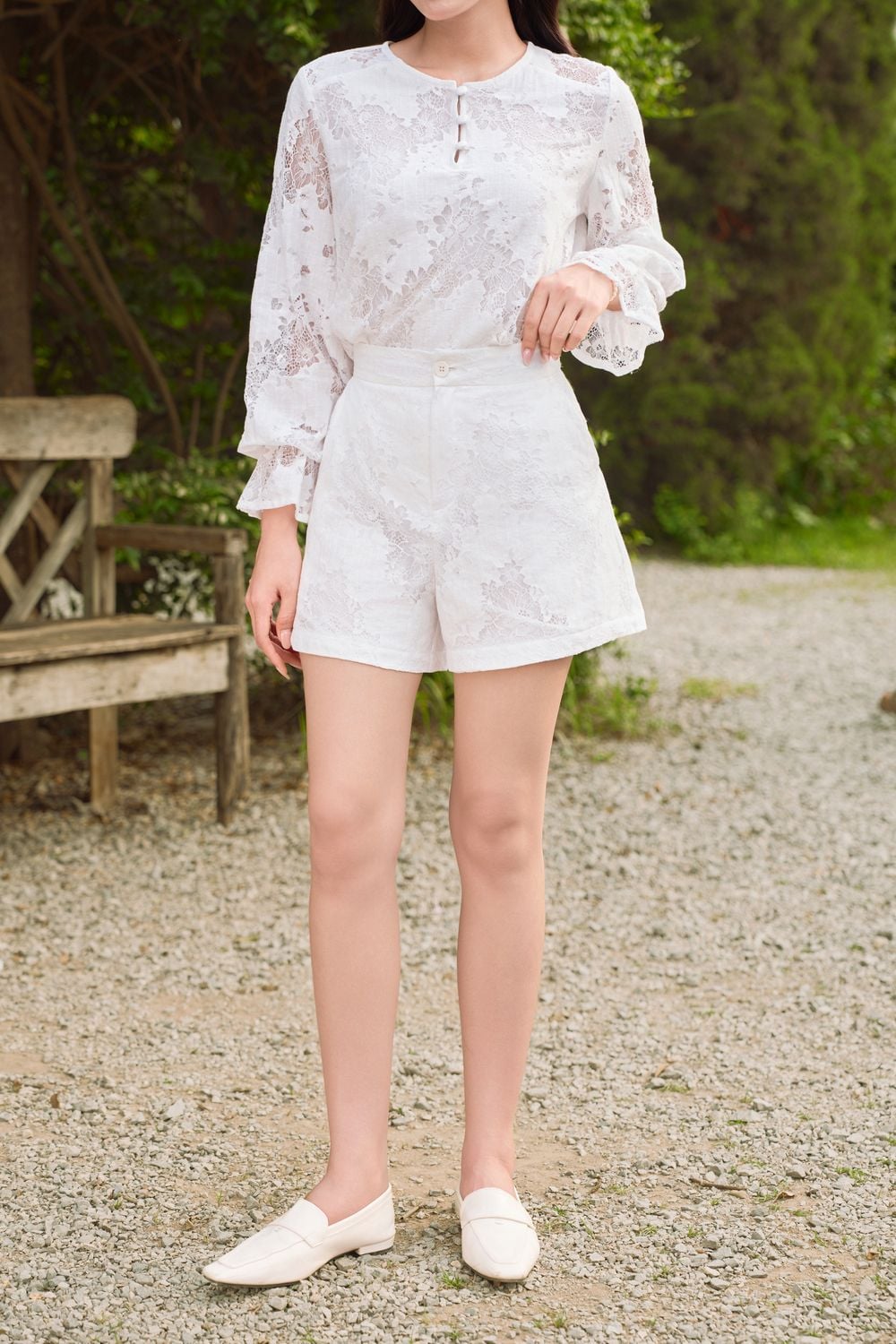 Quần đùi ren thêu lót habutai túi hai bên cúc cài