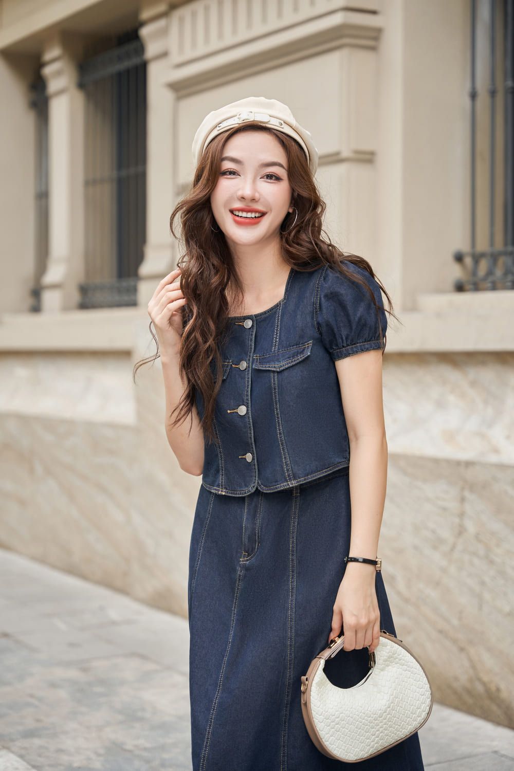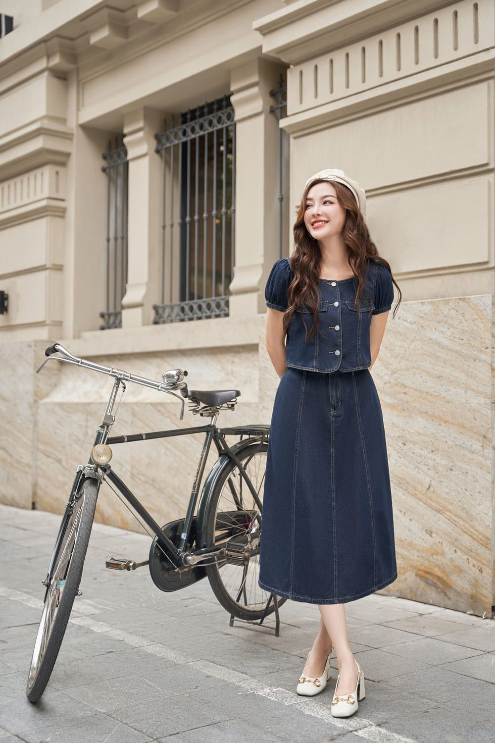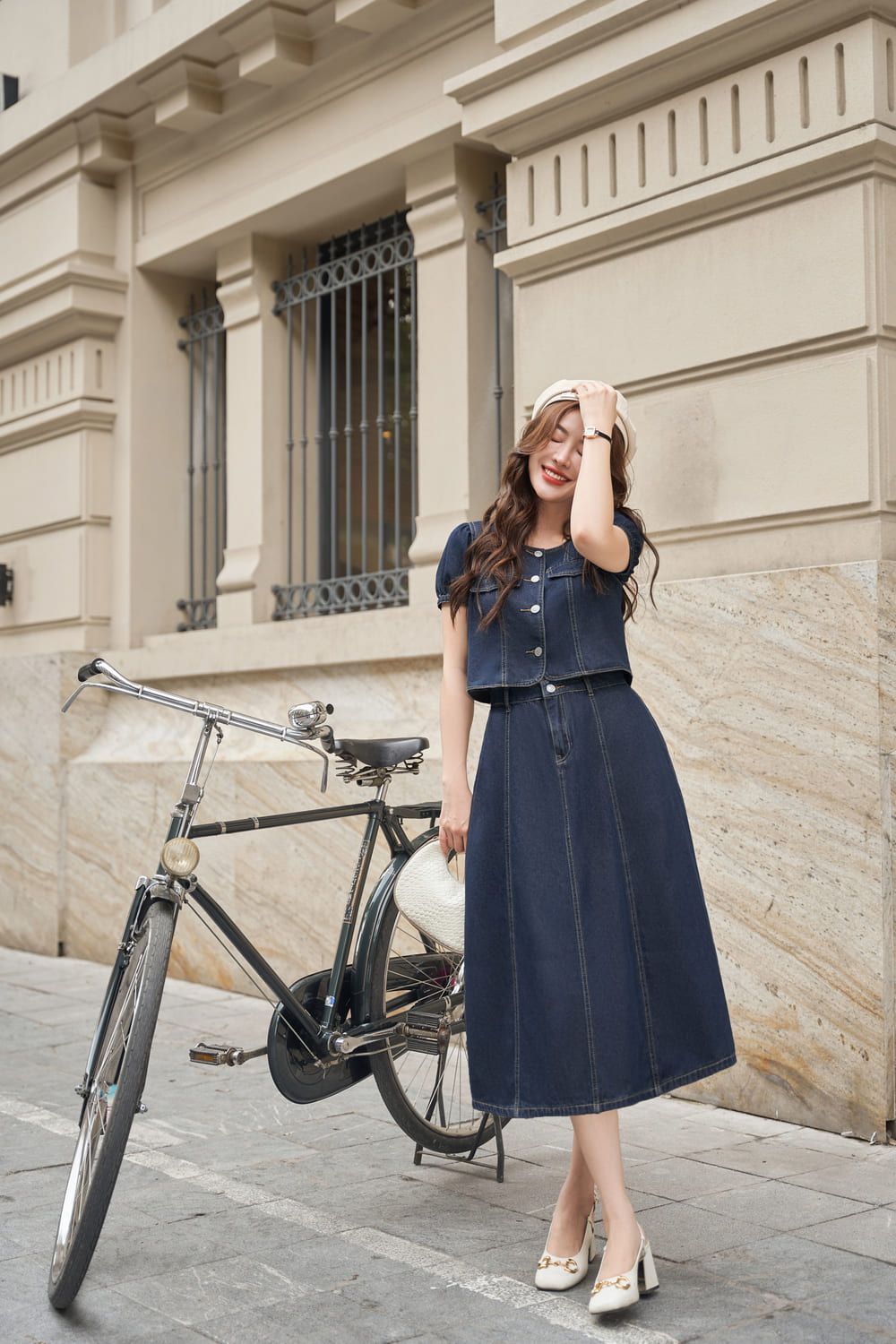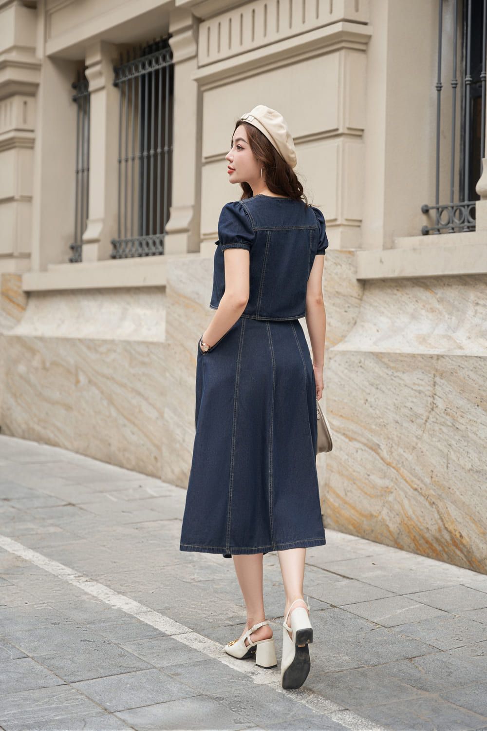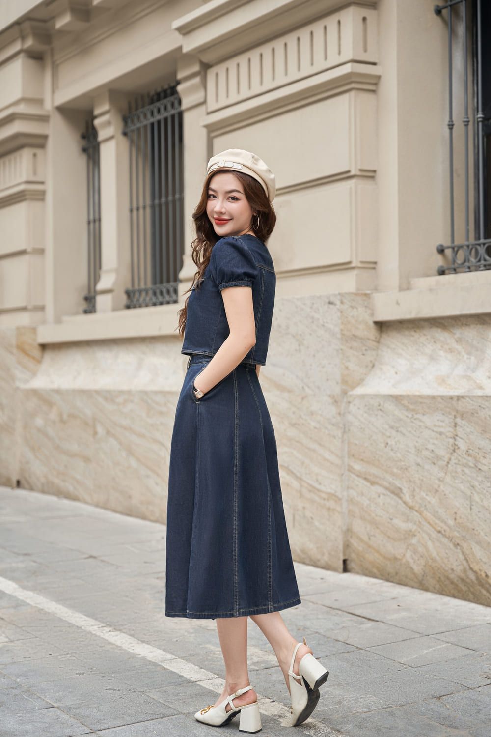 Mua chân váy mix áo cổ vuông thanh lịch, chất jean giấy cao cấp, tone màu xanh đậm không kén da, mặc trẻ trung, cá tính. Giao hàng toàn quốc, kiểm tra trước khi thanh toán